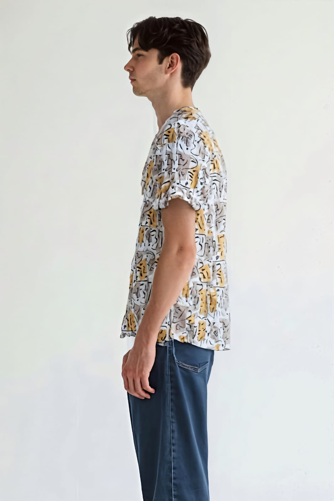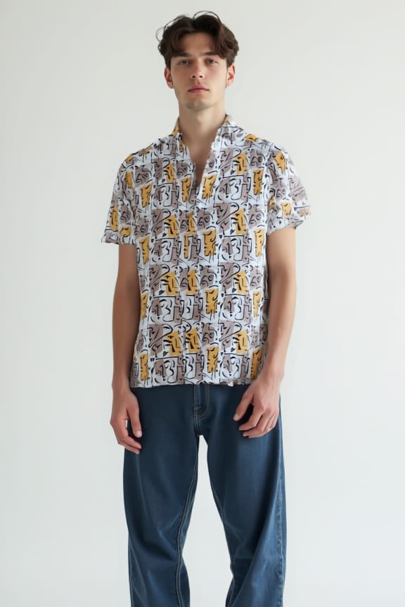 This shirt features a modern abstract face print in a striking palette of mustard, black, and white. Made from Poplin Cotton fabric. It has open collar and front open buttoned closure short sleeve shirt. It has relaxed fit, it’s your go-to for casual days with a creative twist.