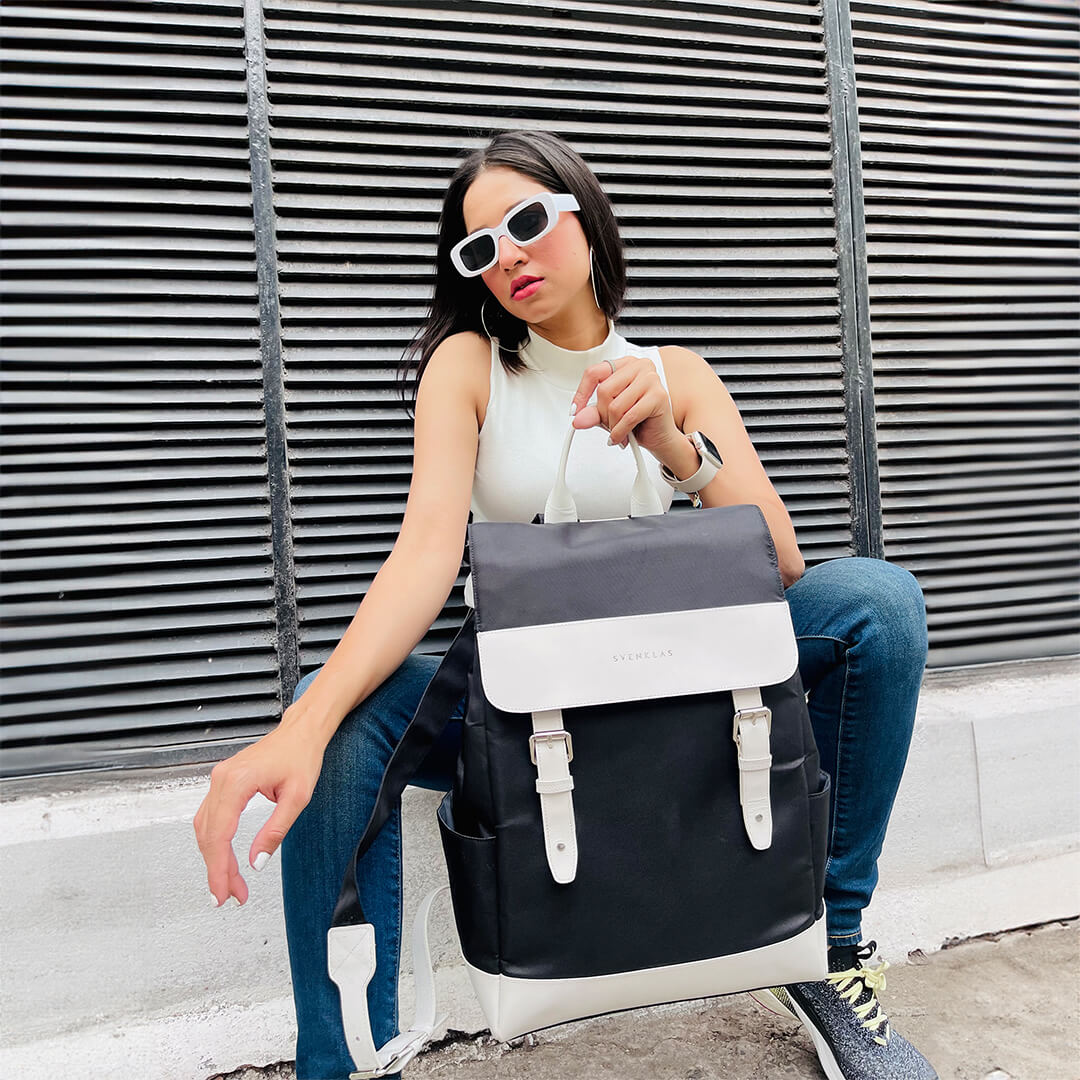 - Adjustable shoulder straps with metallic buckle and leather accents for comfort and fit.