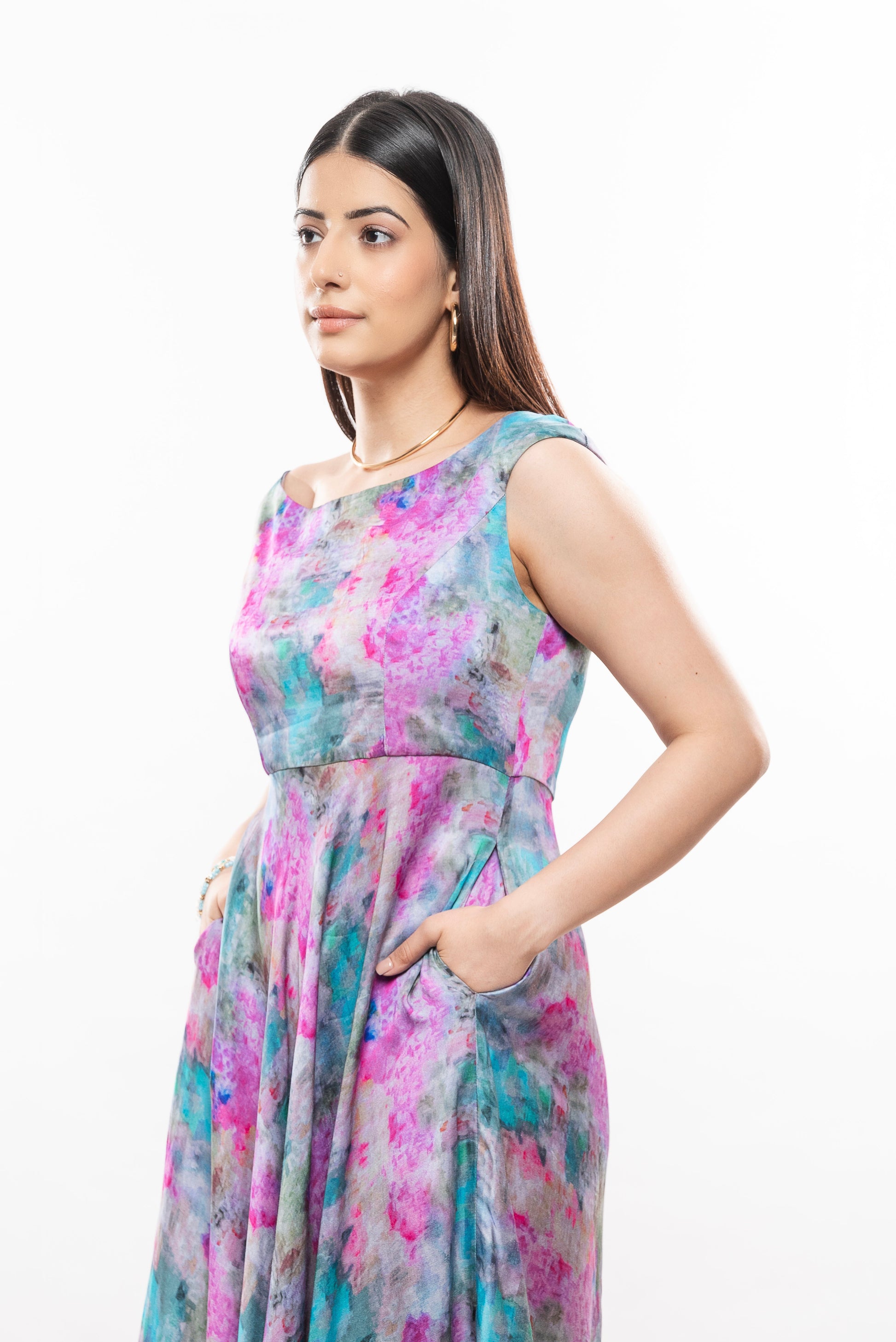 The Aurora Off Shoulder Dress display an elegant off-shoulder neckline with princess cut-and-sew detailing, sleeveless design, and a knee-length flared silhouette. Crafted from opulent modal satin with an abstract print, this comfort-fit dress is both stylish and effortless.