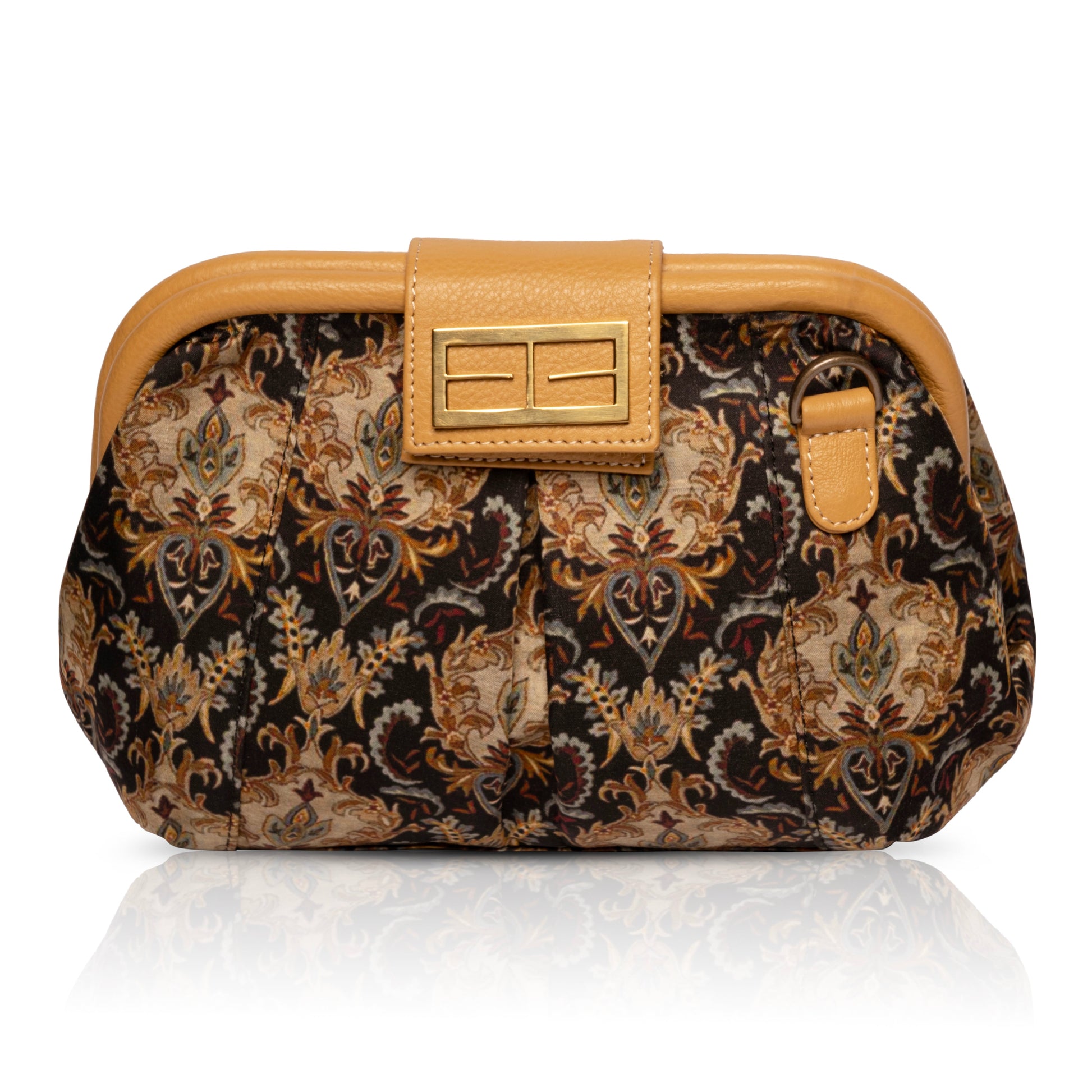 This versatile sling bag cum clutch, crafted from luxurious modal silk with matching leather details, is a perfect blend of elegance and functionality. It features a center box pleat, inside patch pocket, and a zip pocket for added convenience. The adjustable leather strap allows for versatile styling, while the spacious main compartment and two additional pockets keep your essentials organized. Ideal for any occasion, this bag is a must-have accessory for the modern fashionista.