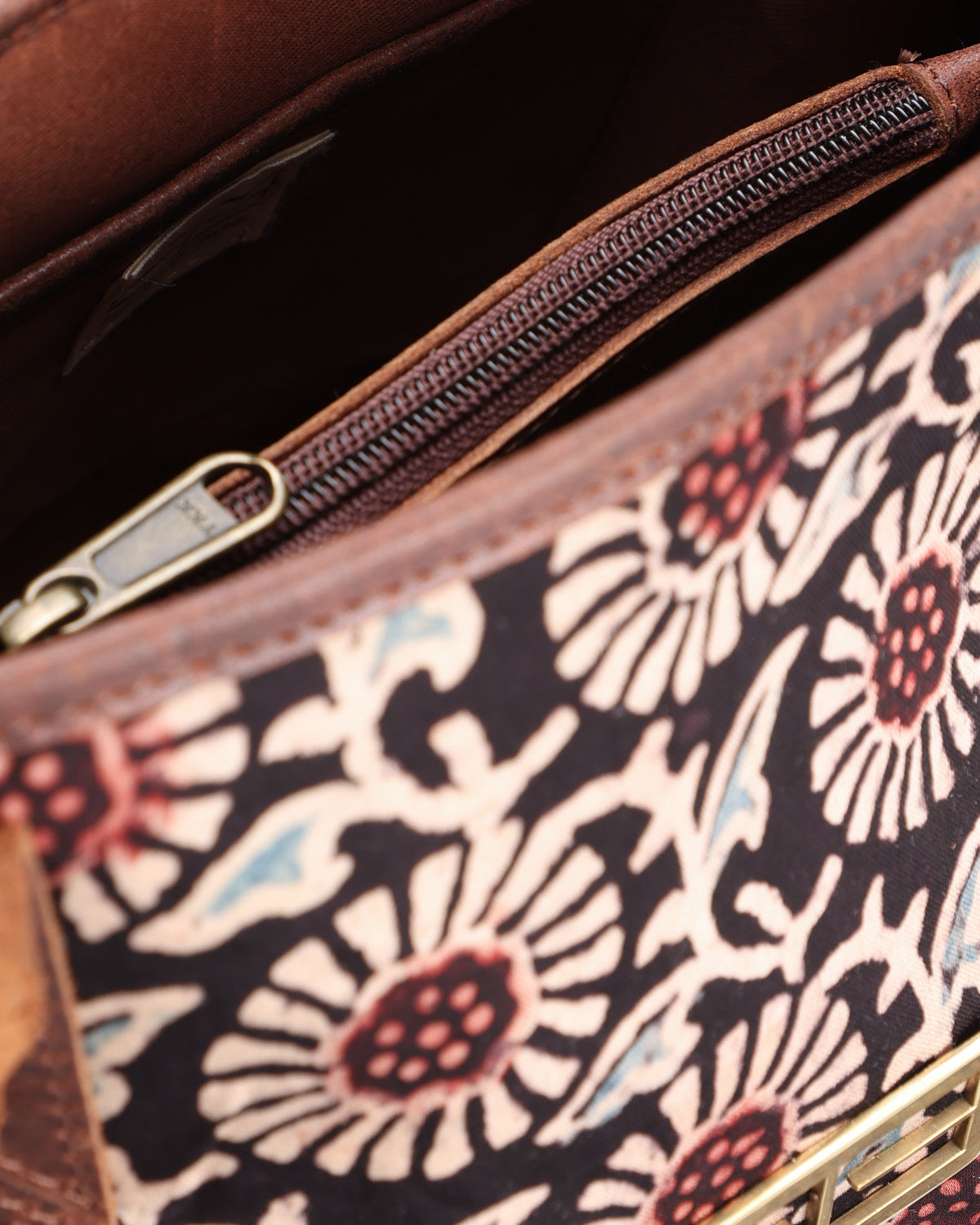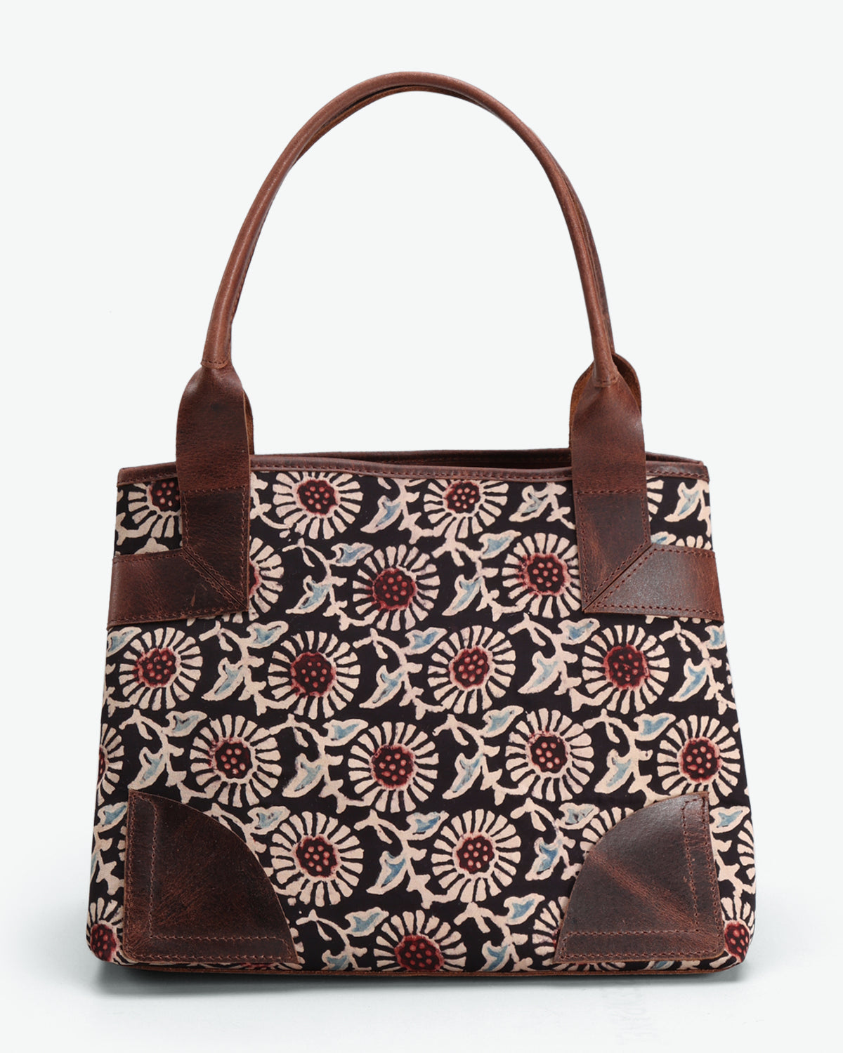 Hand bag with tonal leather handles & details, inside patch pocket and zip pocket, with center partition