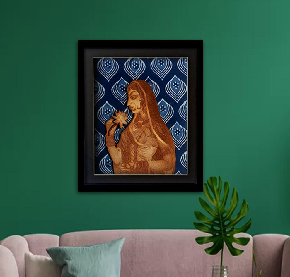 This exquisite wall frame is an appealing sight of the delicate wood engraving of Rajasthan princess inspired from miniature painting. it's a wonderful piece suited to fit with elegance in any corner of your home/office/ creative space.