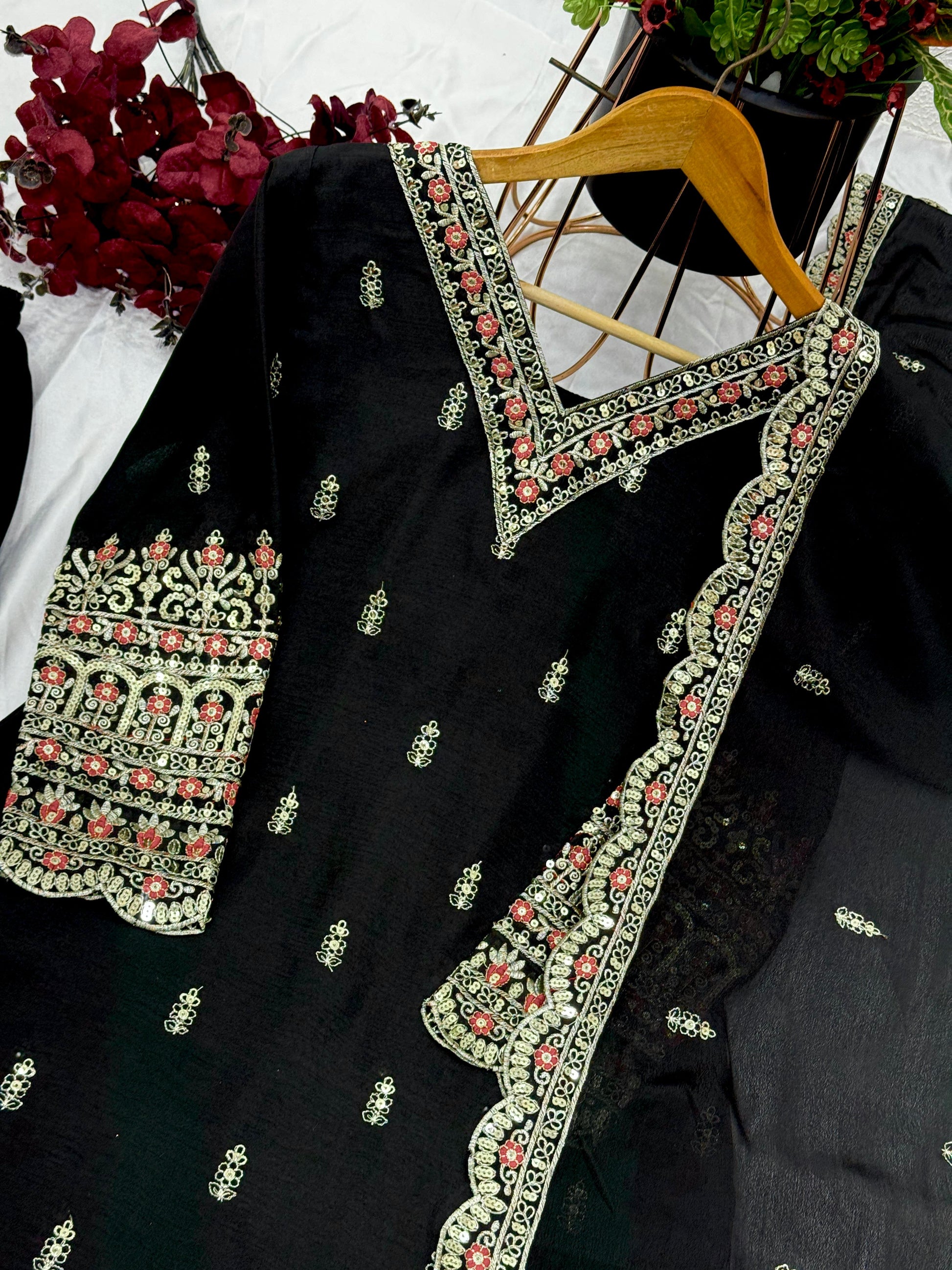 *Presenting New Chinnon Silk With Heavy Embroidery Sequence Work Top-Plazo And Dupatta Set With Fully Stitched Ready To Wear Collection *