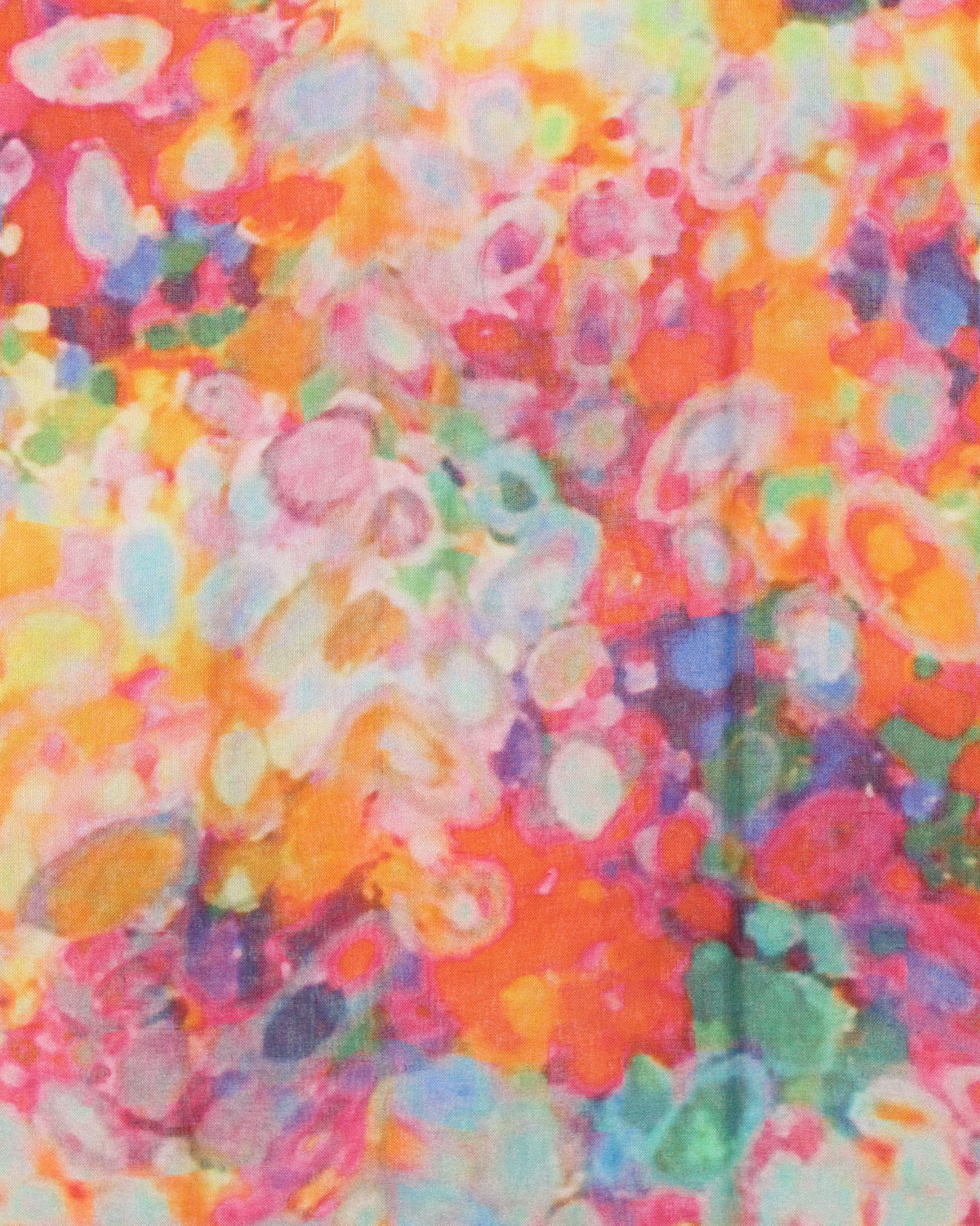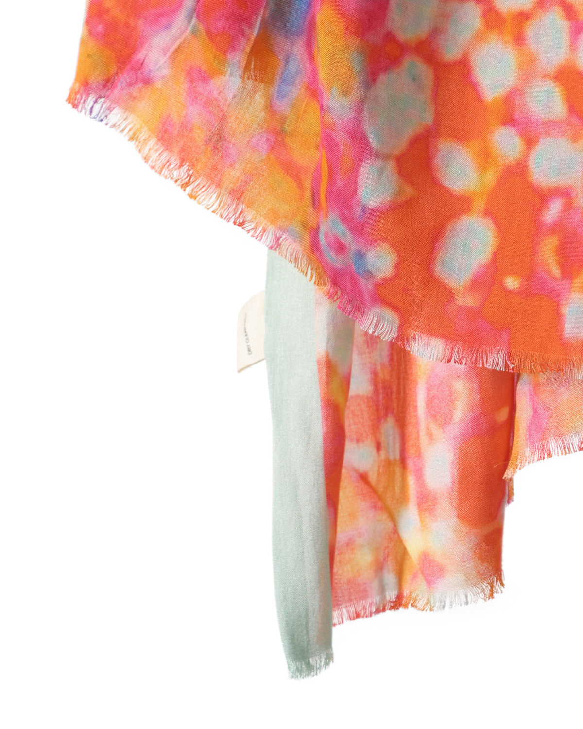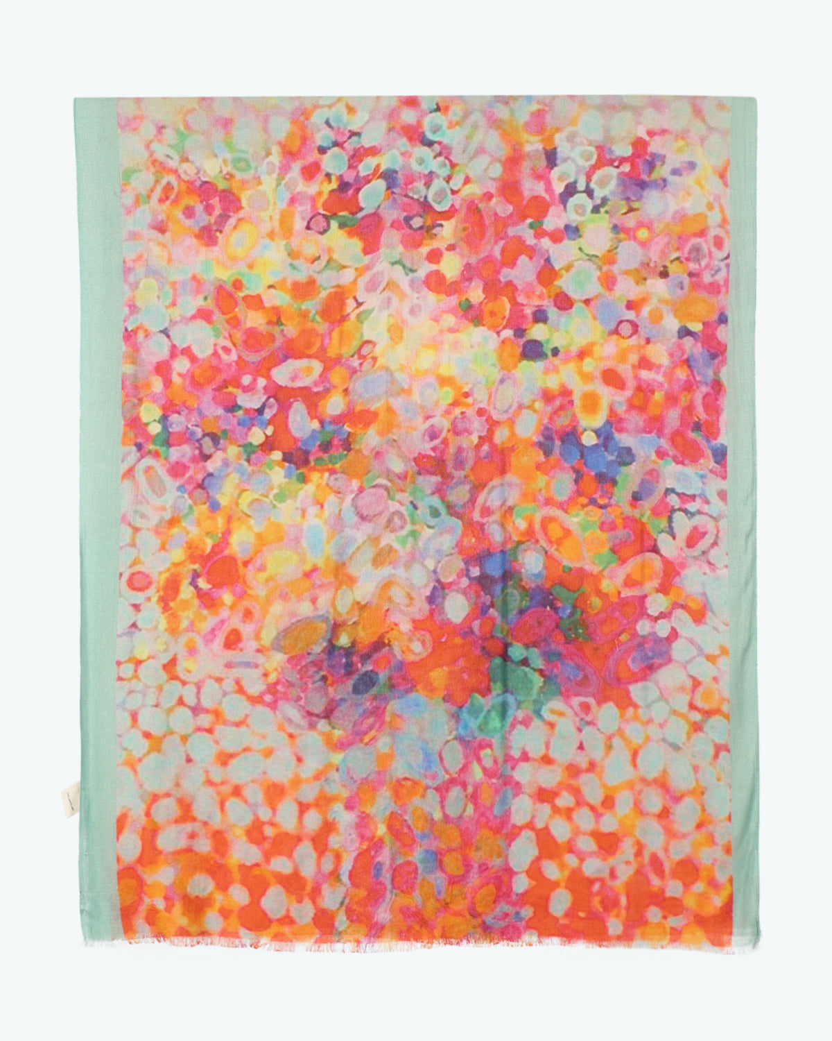 Vibrant color burst scarf in pink, red, blue, and green tones, crafted from Modal for caring warmth.
