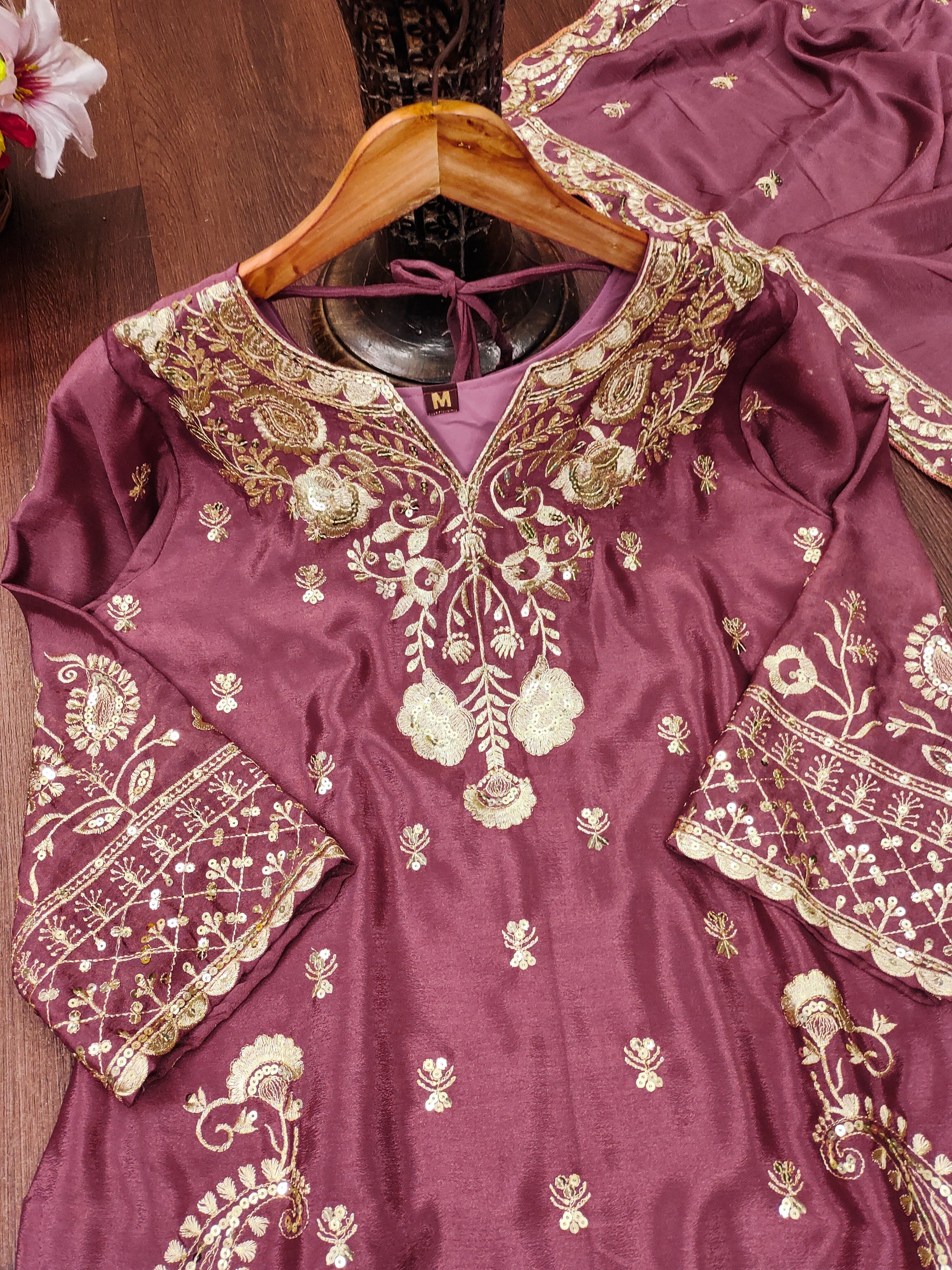 Designer Embroidered Chinon Sharara Suit And Dupatta