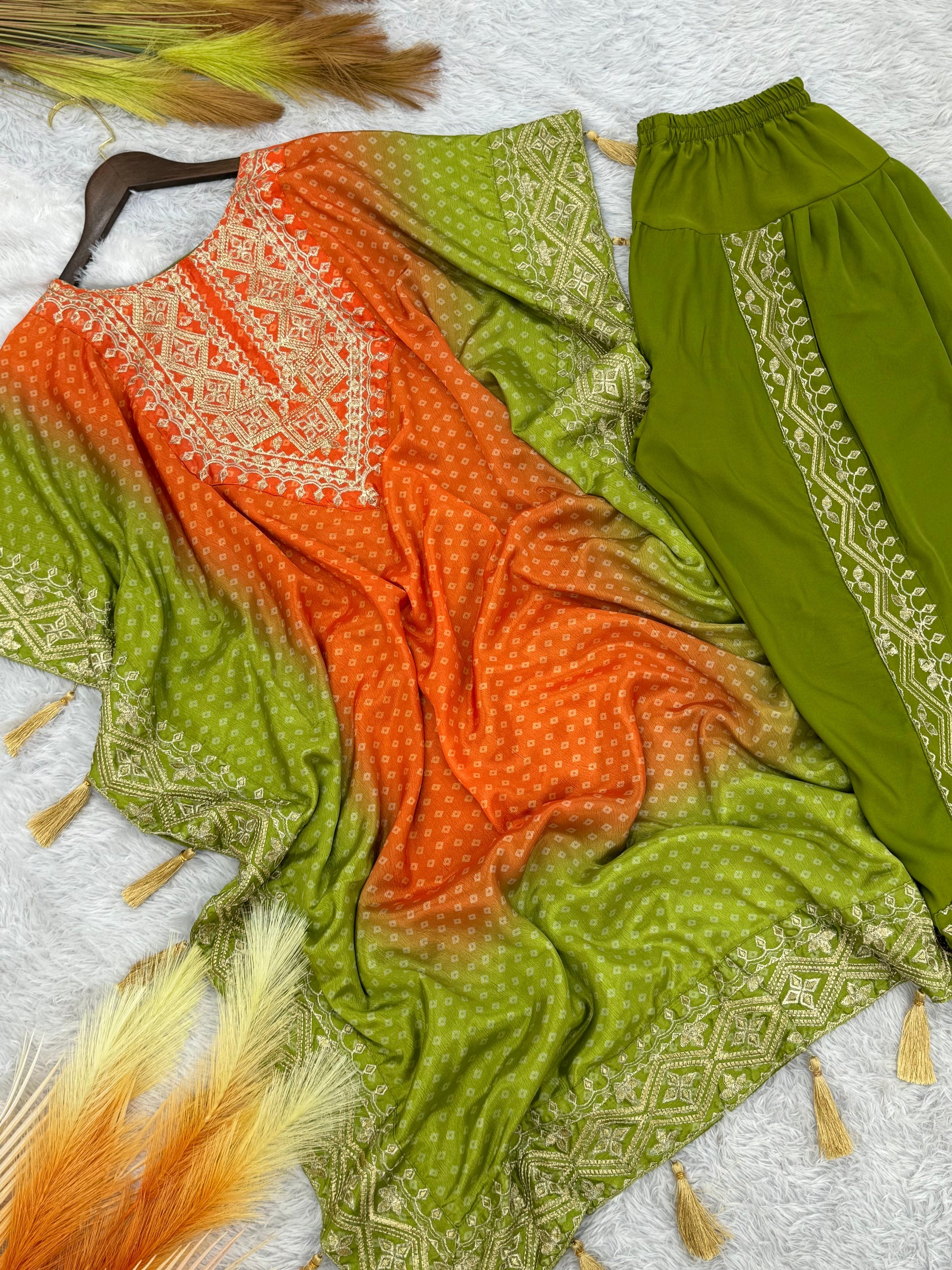 *Stunning Embroidery Work Pure Chinon Silk Kaftan With Dhoti Set*