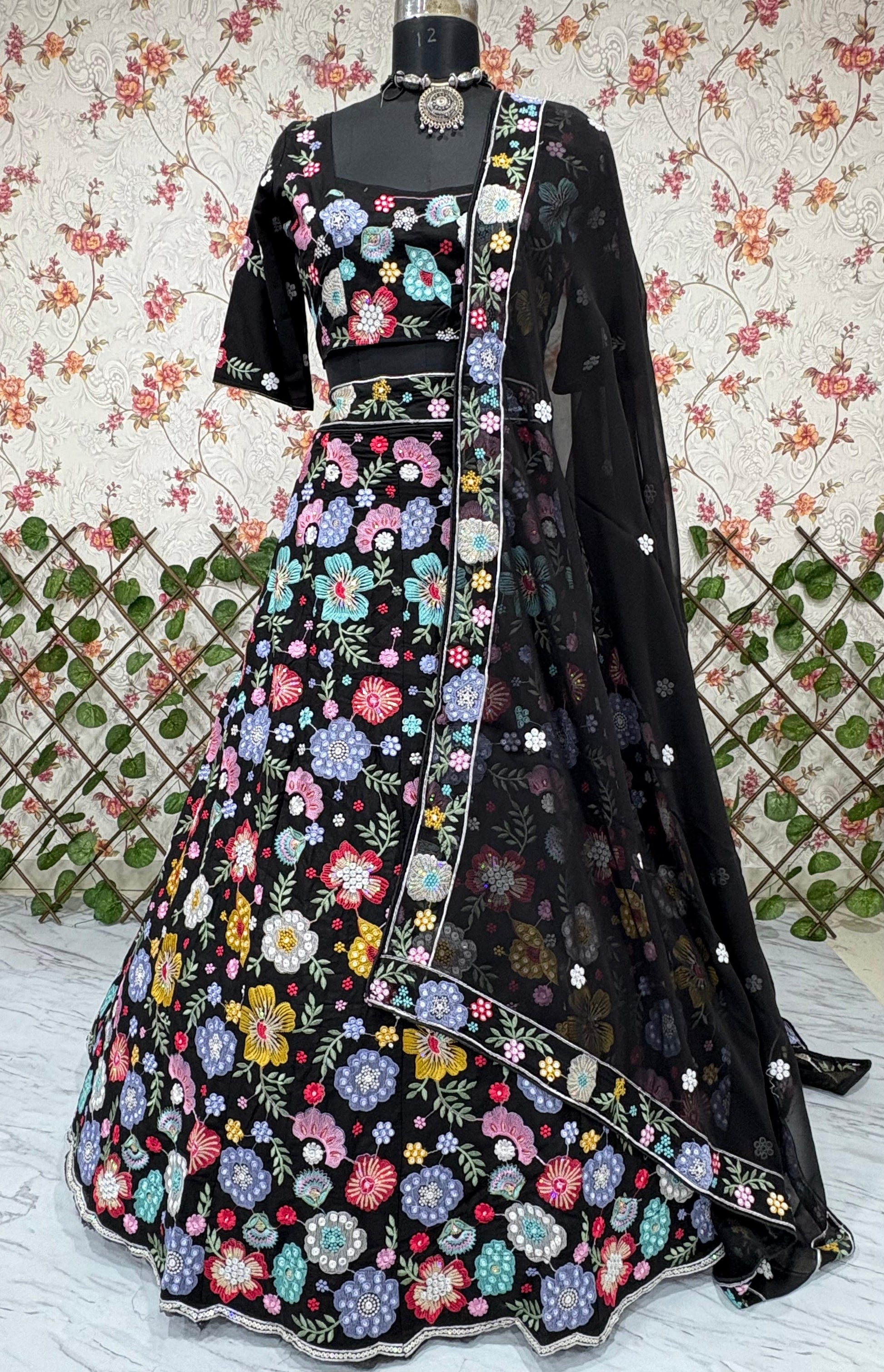 Lehenga : *Premium Faux Georgette Embellished With Beautiful Multi Thread Embroidery With Beautiful Heavy Sequins Work With Heavy Cancan And Canvas With Double Inner Covering With 3.5 Mtr Flair*( Semi Stitched. )