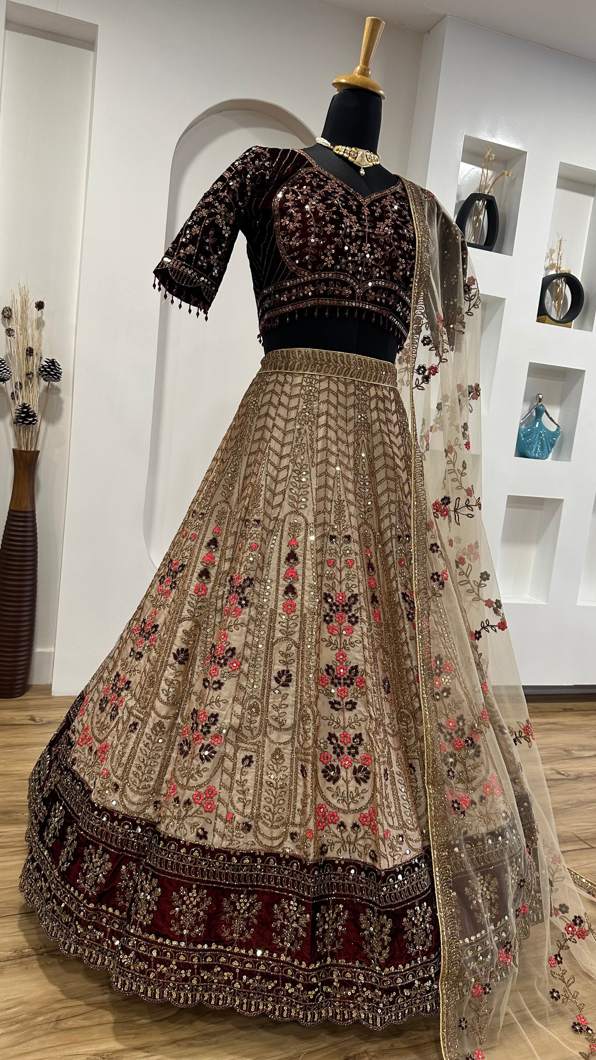 Heavy Kasturi silk lehenga with Dori , sequins & thread work along with velvet border