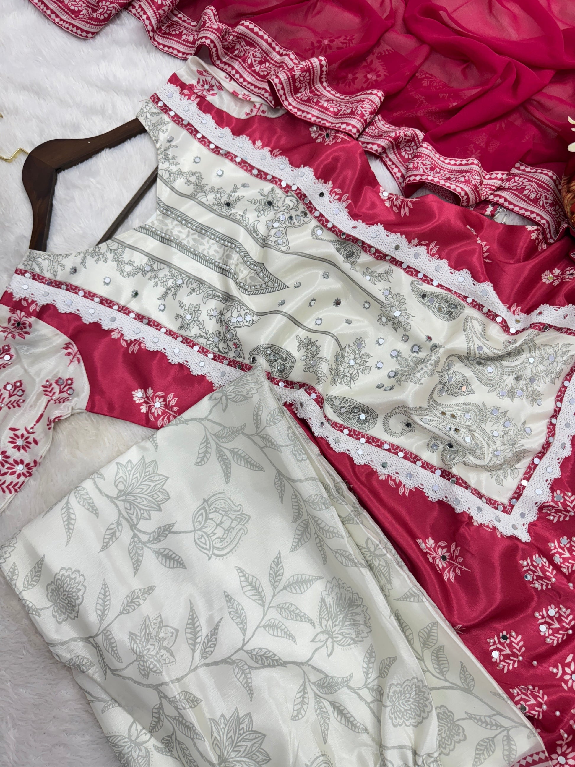 *Plazzo Fabrics* : Heavy Chinon Silk With Fancy Digital Print And Hanging Latkan Lace Border