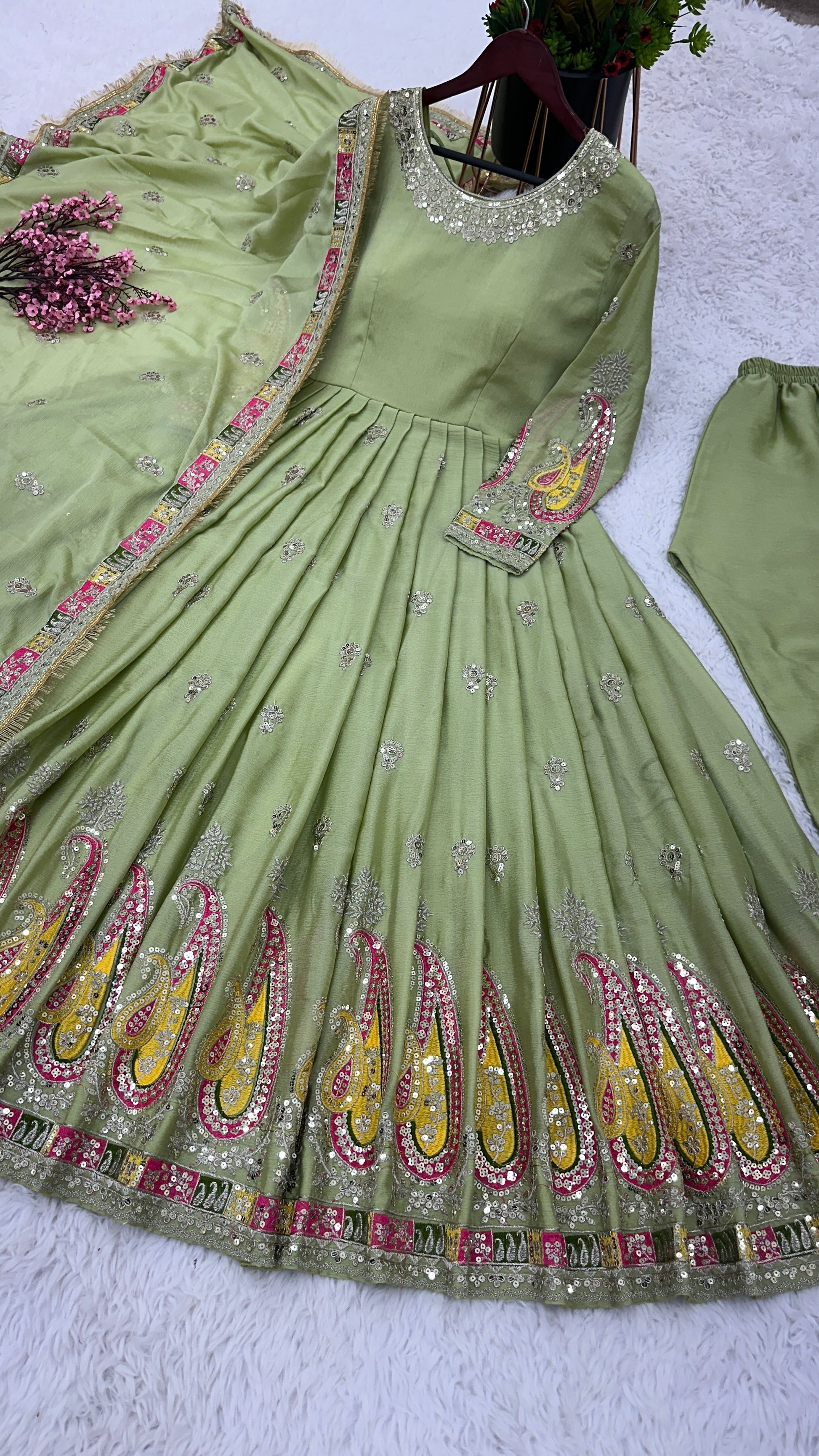 *Gown Fabric* :Pure Heavy Chonon Silk With *Full Heavy Embroidery Sequence Work* With *Full Sleeve*