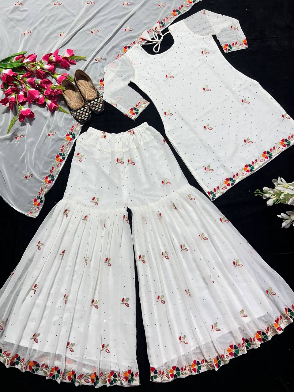 *Sharara Palazzo* : Heavy Faux Georgette With Multi Embroidery Work with Diamond Hand Work.