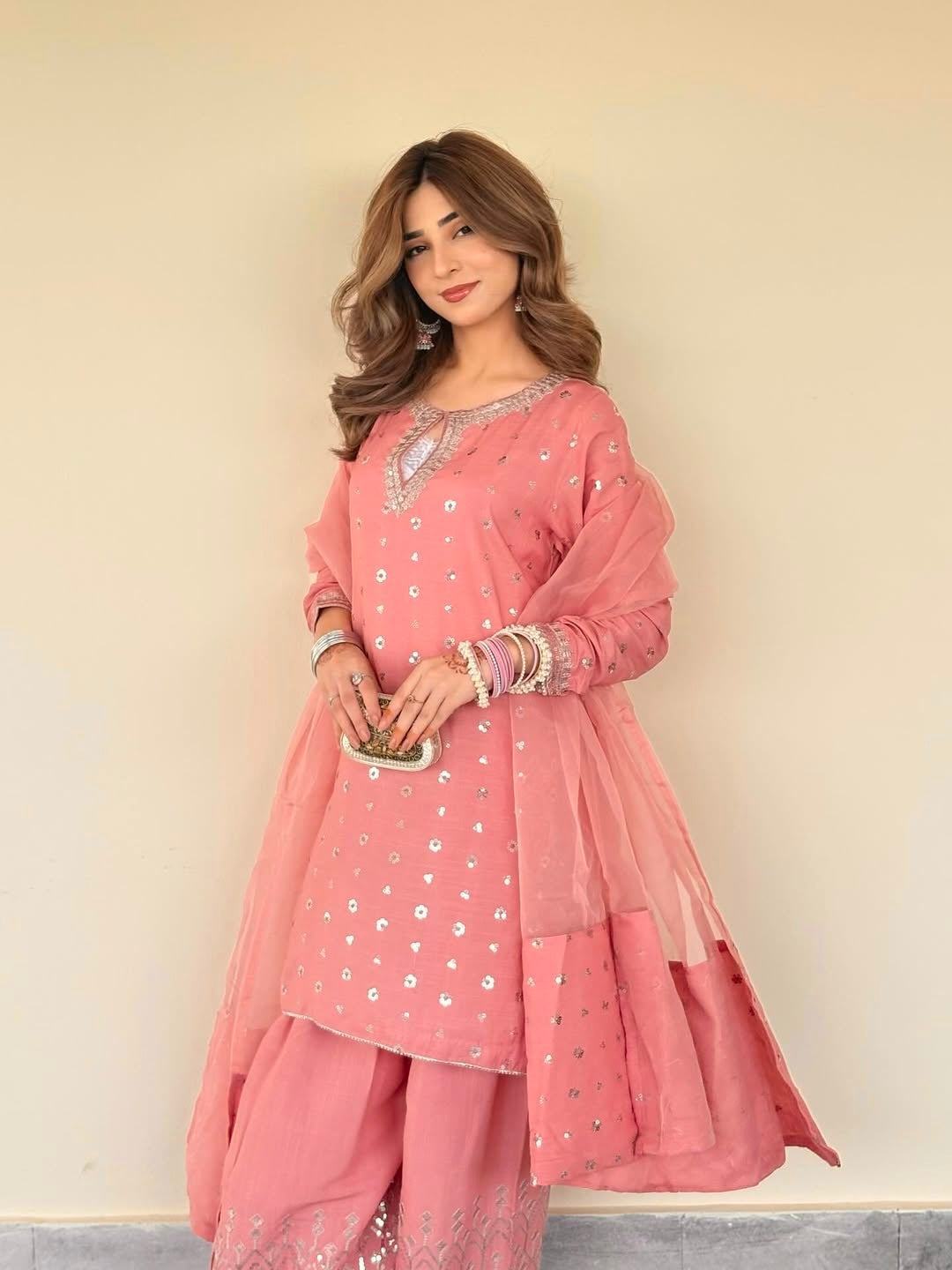 *Farshi salwar Fabric*: Heavy Heavy Chinnon Silk and Multi Needle Work, Sequence 5mm Work, Embroidery Work, Zari Work.