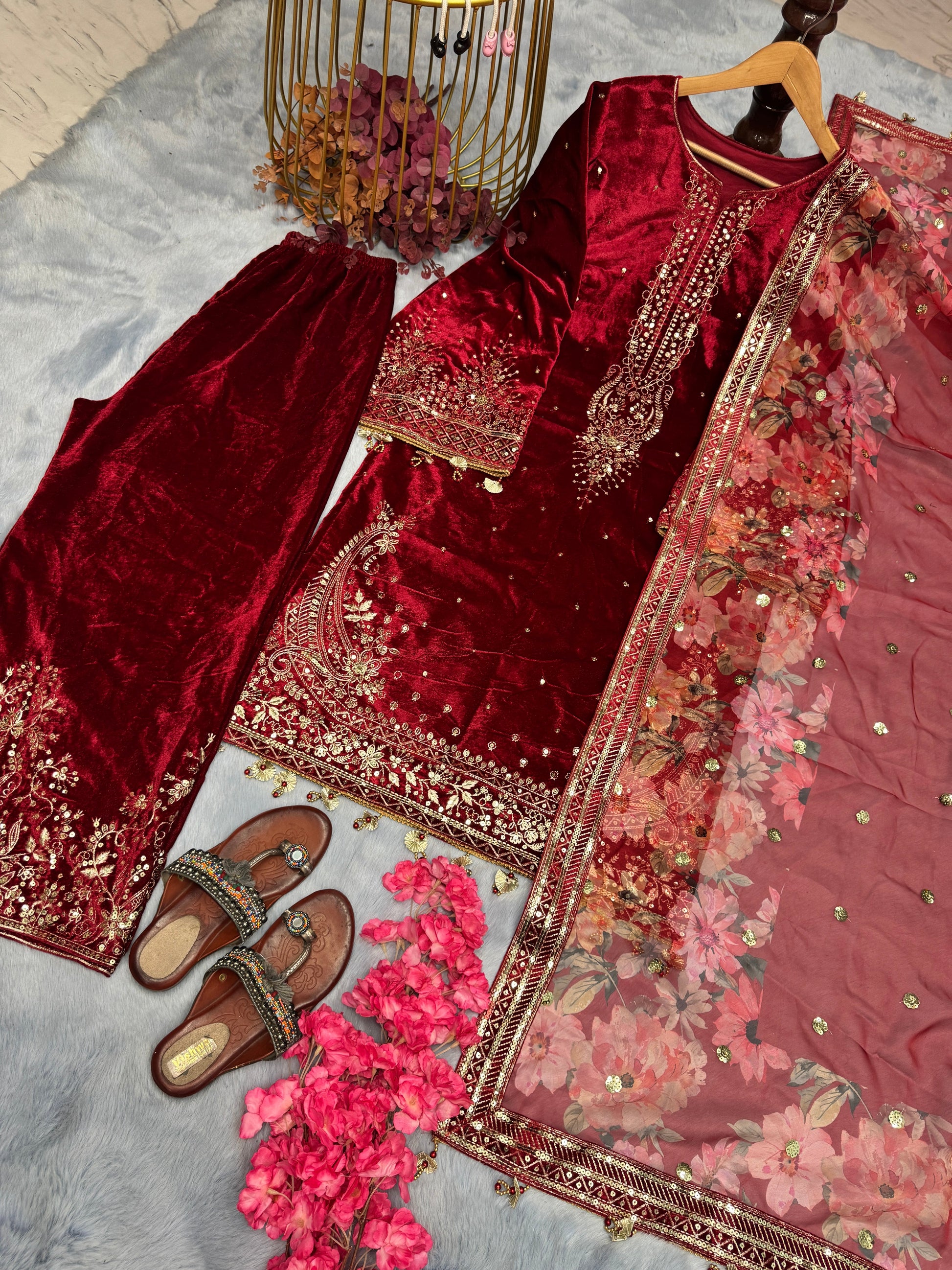 Designer Party Wear Look Velvet Top Plazzo & Dupatta Set