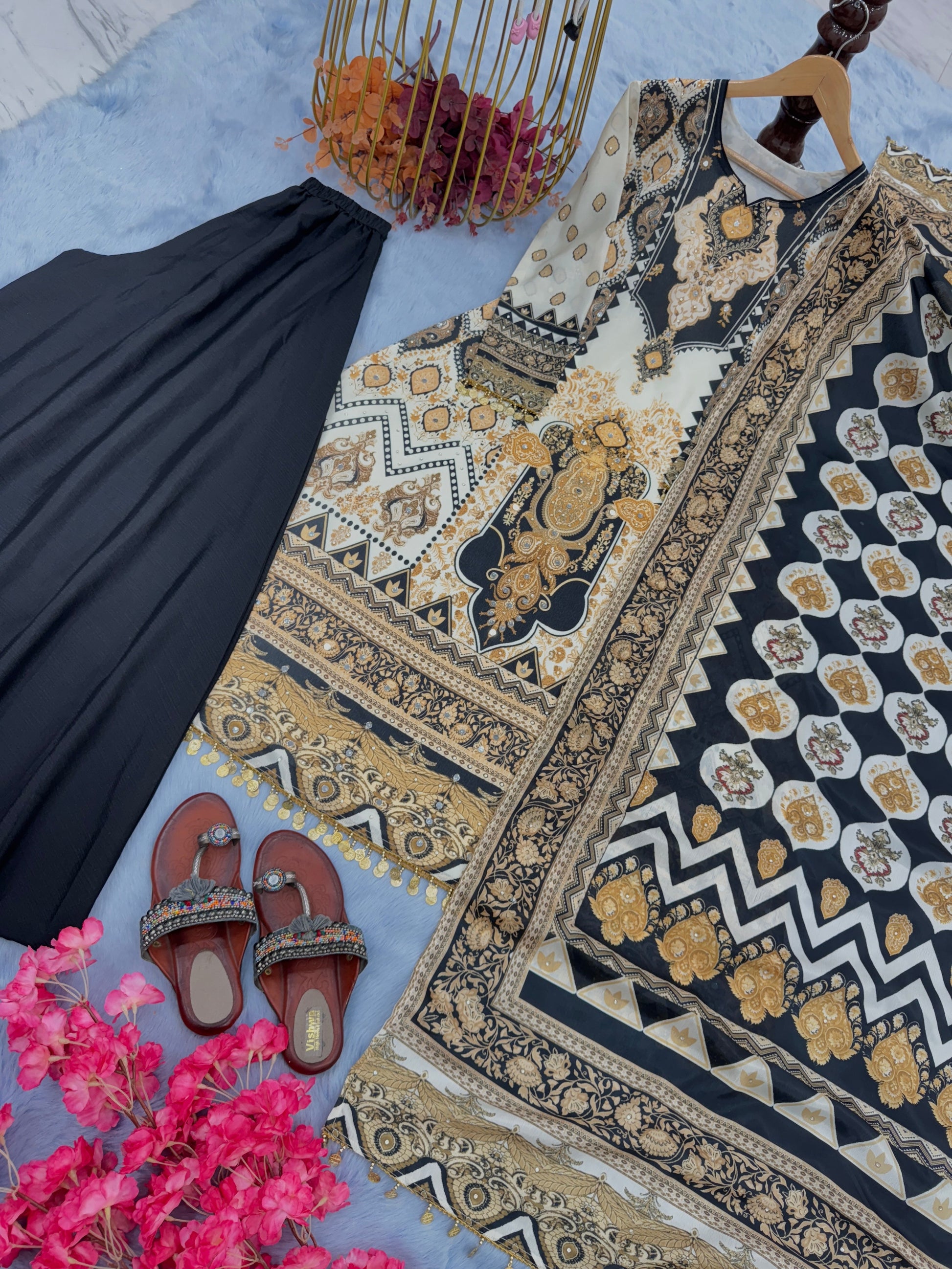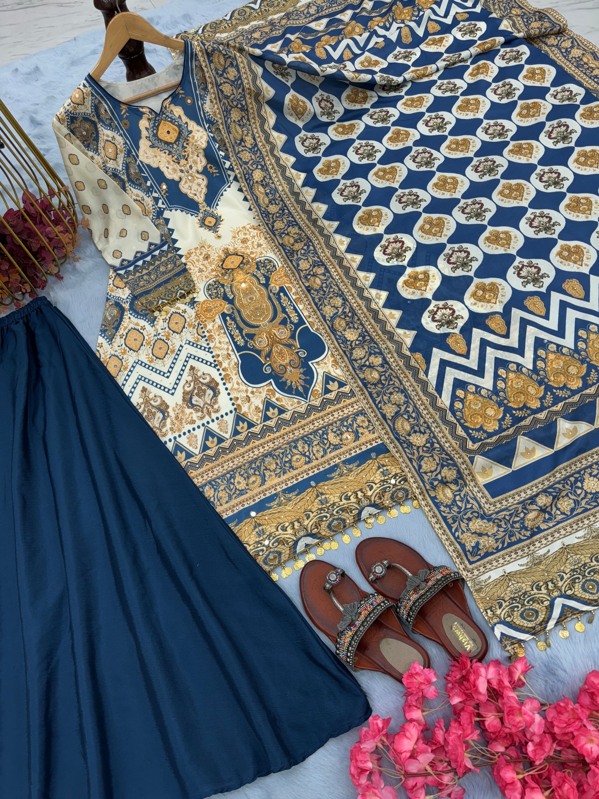 *Top Fabric* :Heavy Chinon Silk With Digital Print With Riyal Mirror & Diamond Hand Work With Sleeves With Fancy Coin Latkan