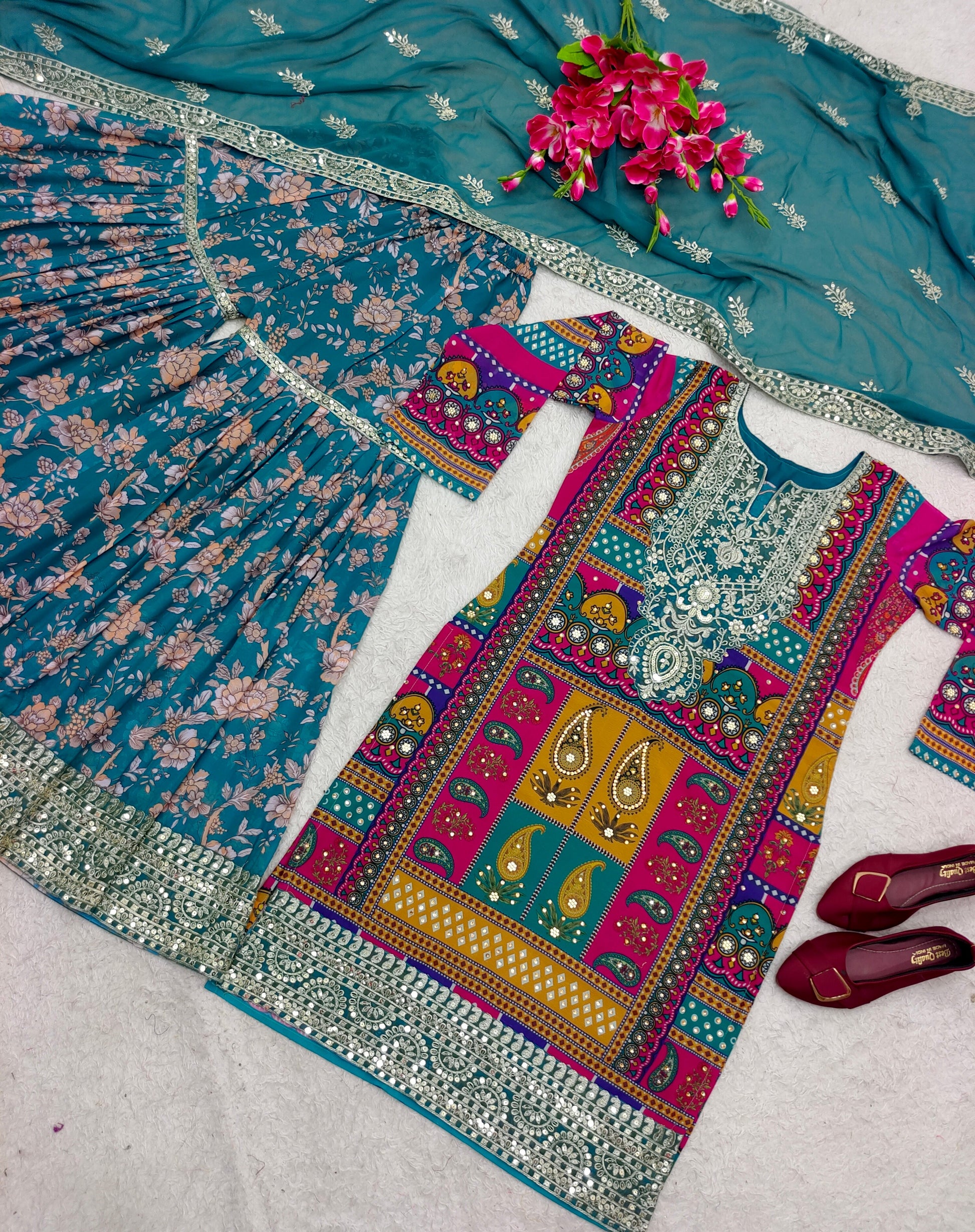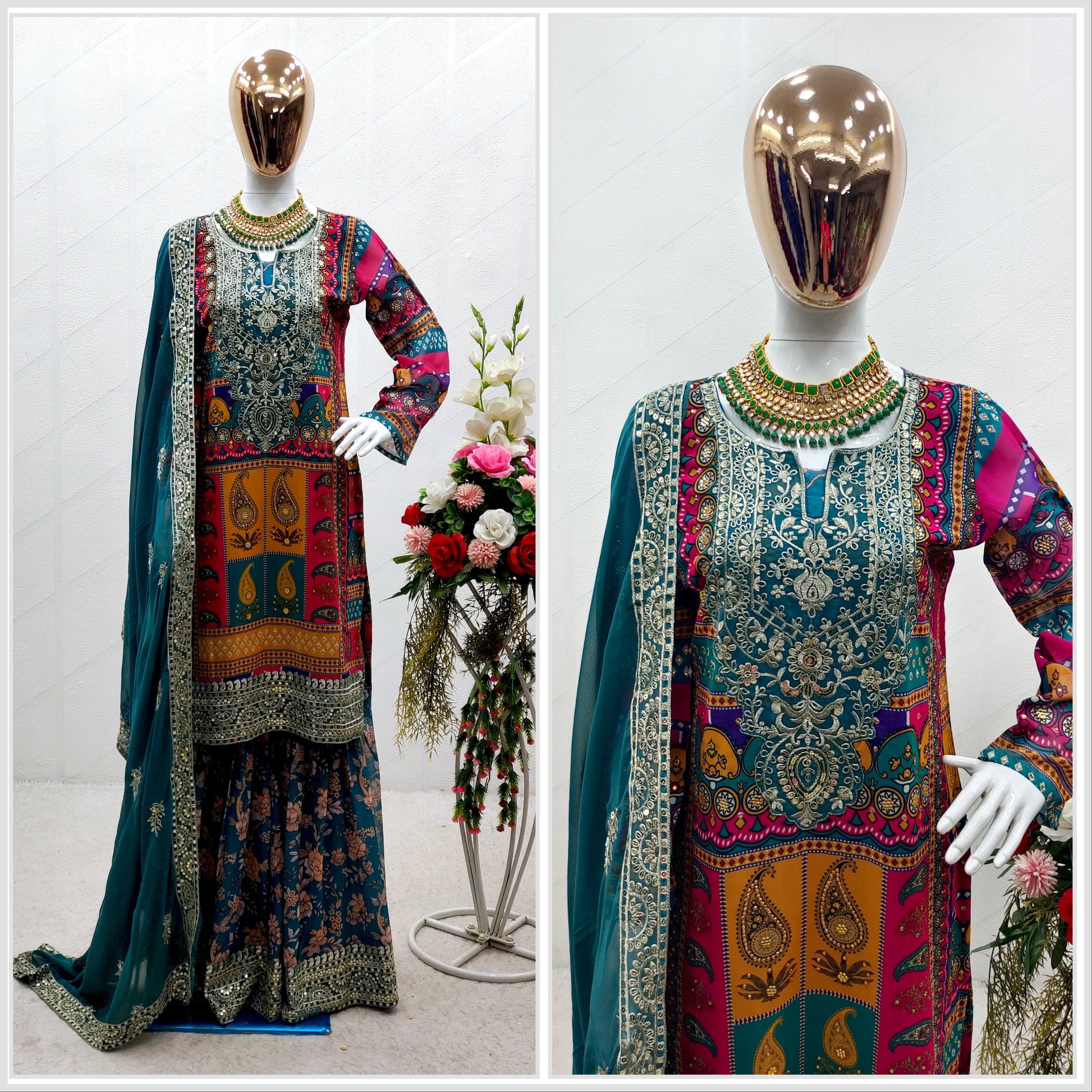 *Top Fabric* : Heavy Pure Fox Georgette With Dijital Print With 5mm Siqwans Embroidery Work With Full-Sleevs With *Dimond Hend-Work*
