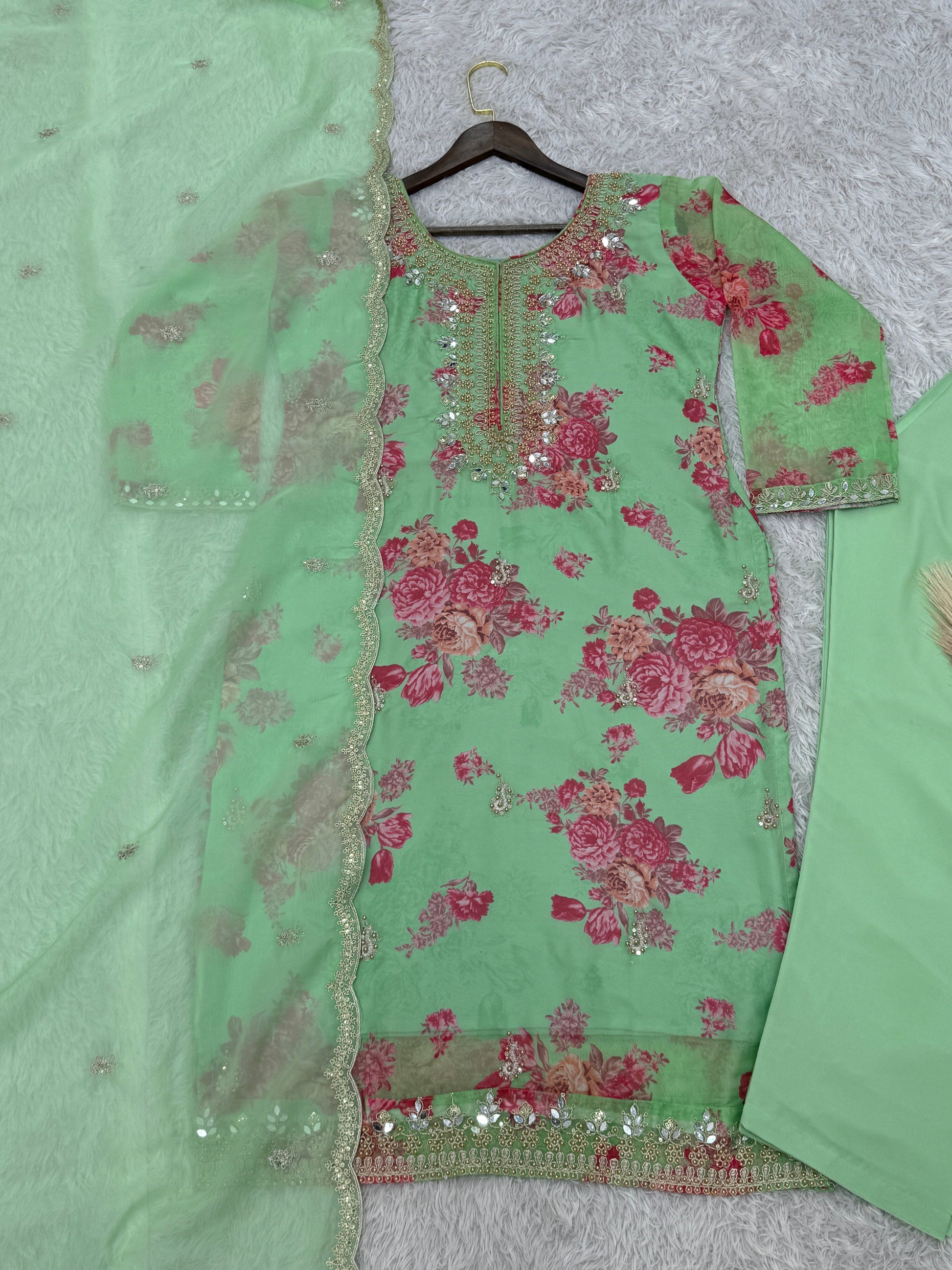 *Presenting New Premium Kundan Organza Suit With Embroidery Coding Dori-Sequence With Heavy Stone Mirror Hand Worked Top-Bottom And Dupatta Set Fully Stitched Ready To Wear*