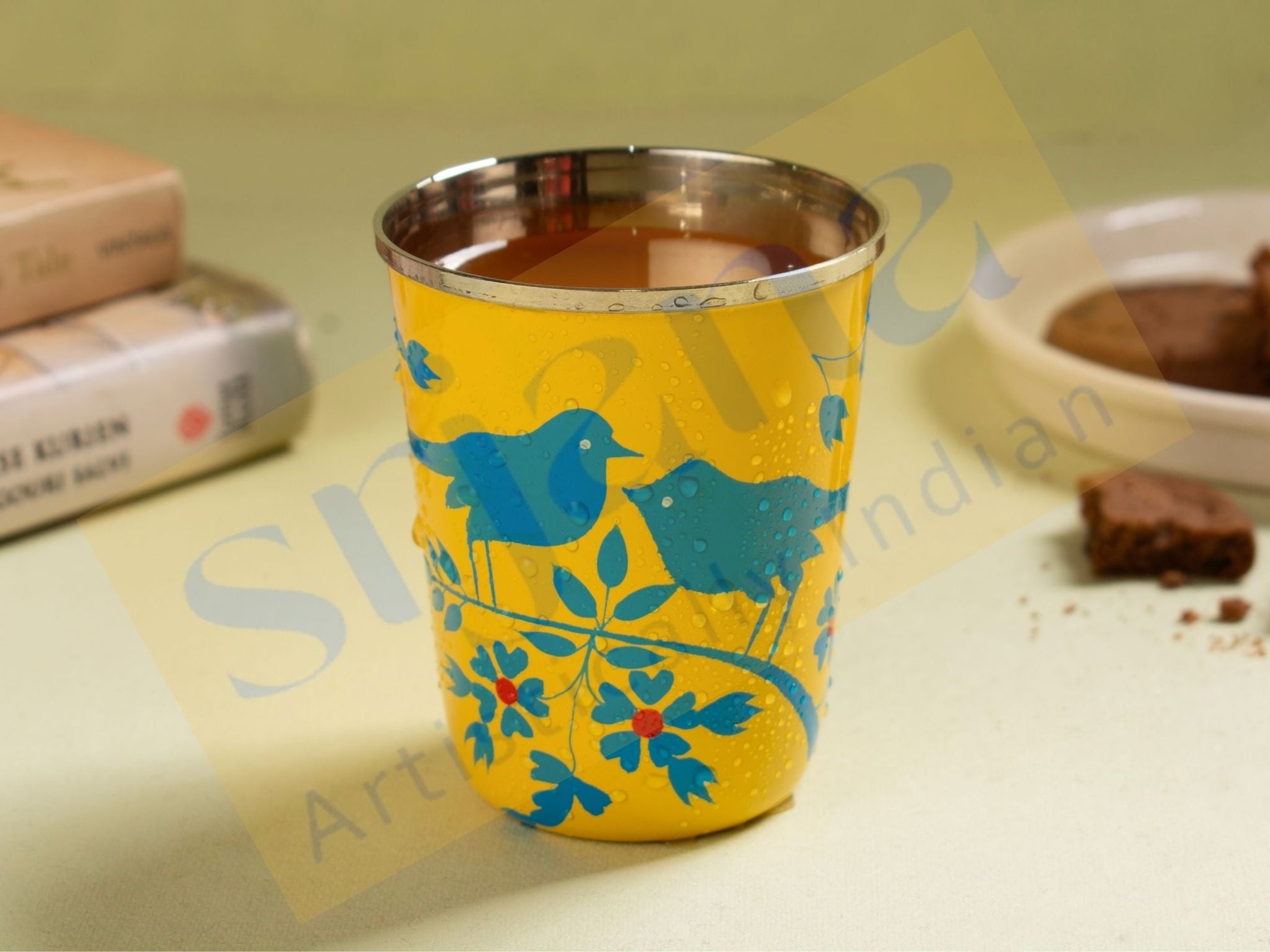 Brighten up your table with this vibrant hand-painted steel glass, featuring charming bird and floral motifs in bold hues. Crafted from high-quality stainless steel and finished with a glossy enamel exterior, this 180 ml glass adds a pop of color and personality to everyday hydration. Lightweight, durable, and easy to clean — it’s as practical as it is playful.
