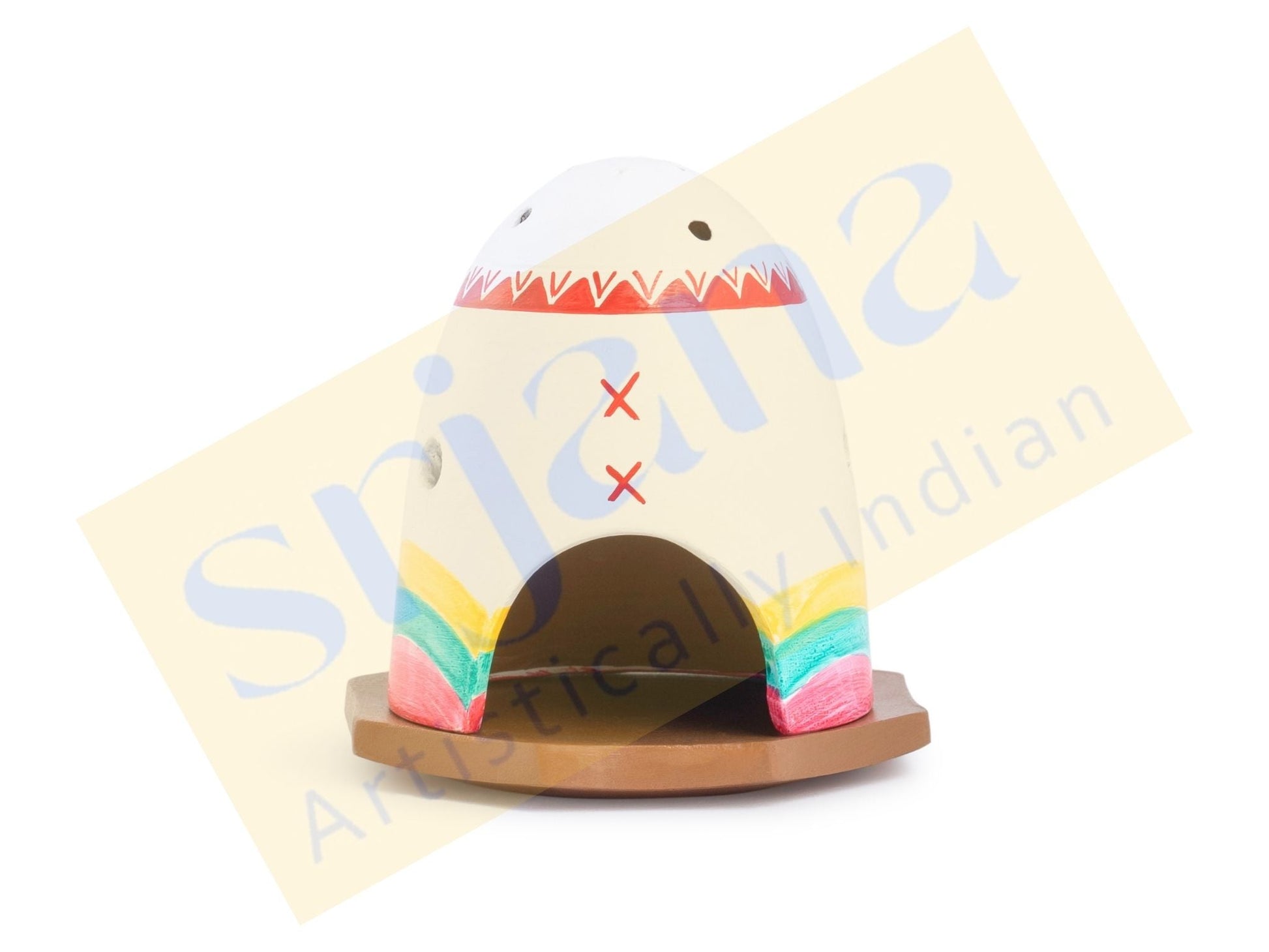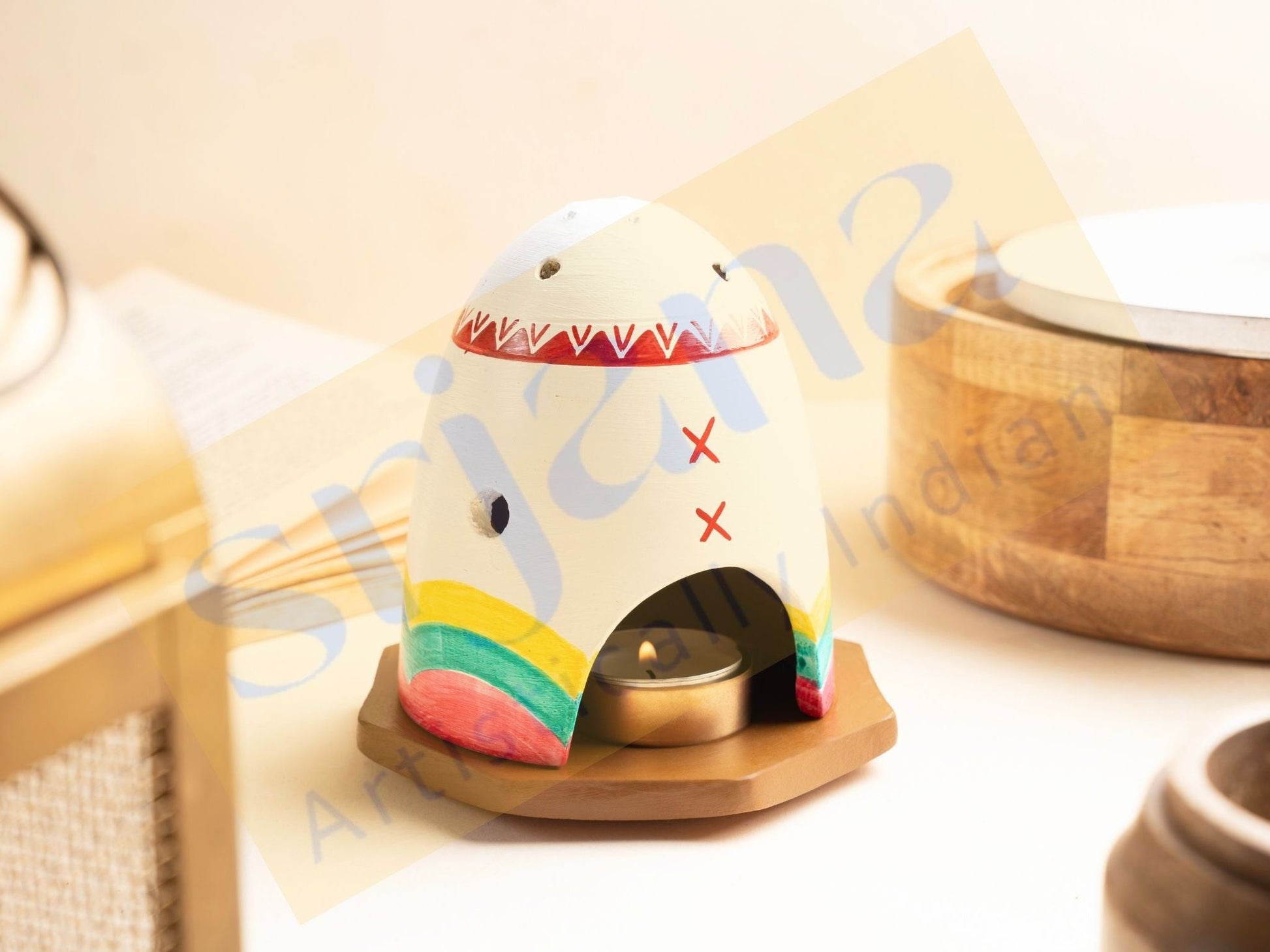 Illuminate your space with this beautifully handcrafted terracotta T-light holder, doubling as an incense stick stand. The intricate hand-painted detailing adds a vibrant touch to your décor while providing a soothing ambiance.