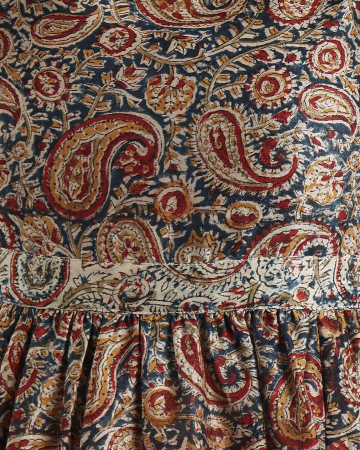 The ideal showstopper high neck knee length dress with a gathered waistline and cuffed sleeves in the beautiful Kalamkari print on silk cotton for the queen within you!