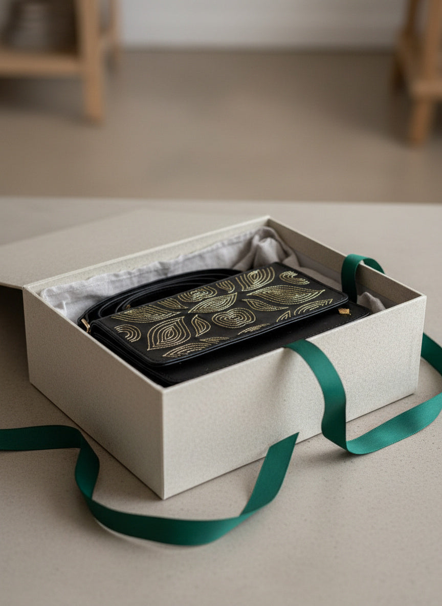 Elevate your style with the Lana Sling Bag by Green Hermitage. Crafted from premium black vegan leather, this refined design features an elegant golden pattern inspired by modern minimalism.