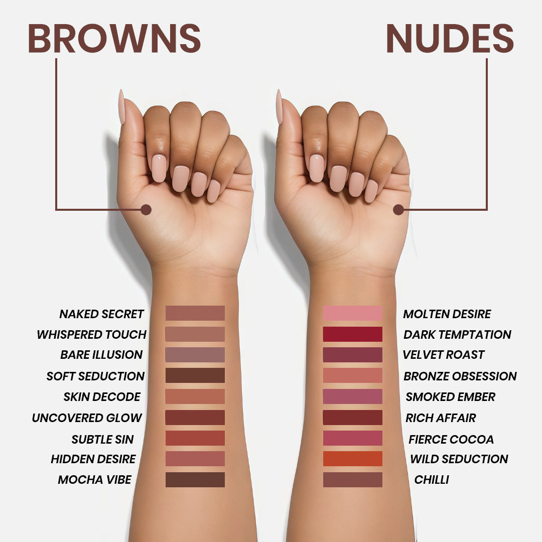 Give your lips the luxury they deserve with the Luxe Matte Long Stay Mousse Lipstick – a versatile collection of 9 richly pigmented liquid lipsticks, available in two timeless variants: Nudes & Browns.