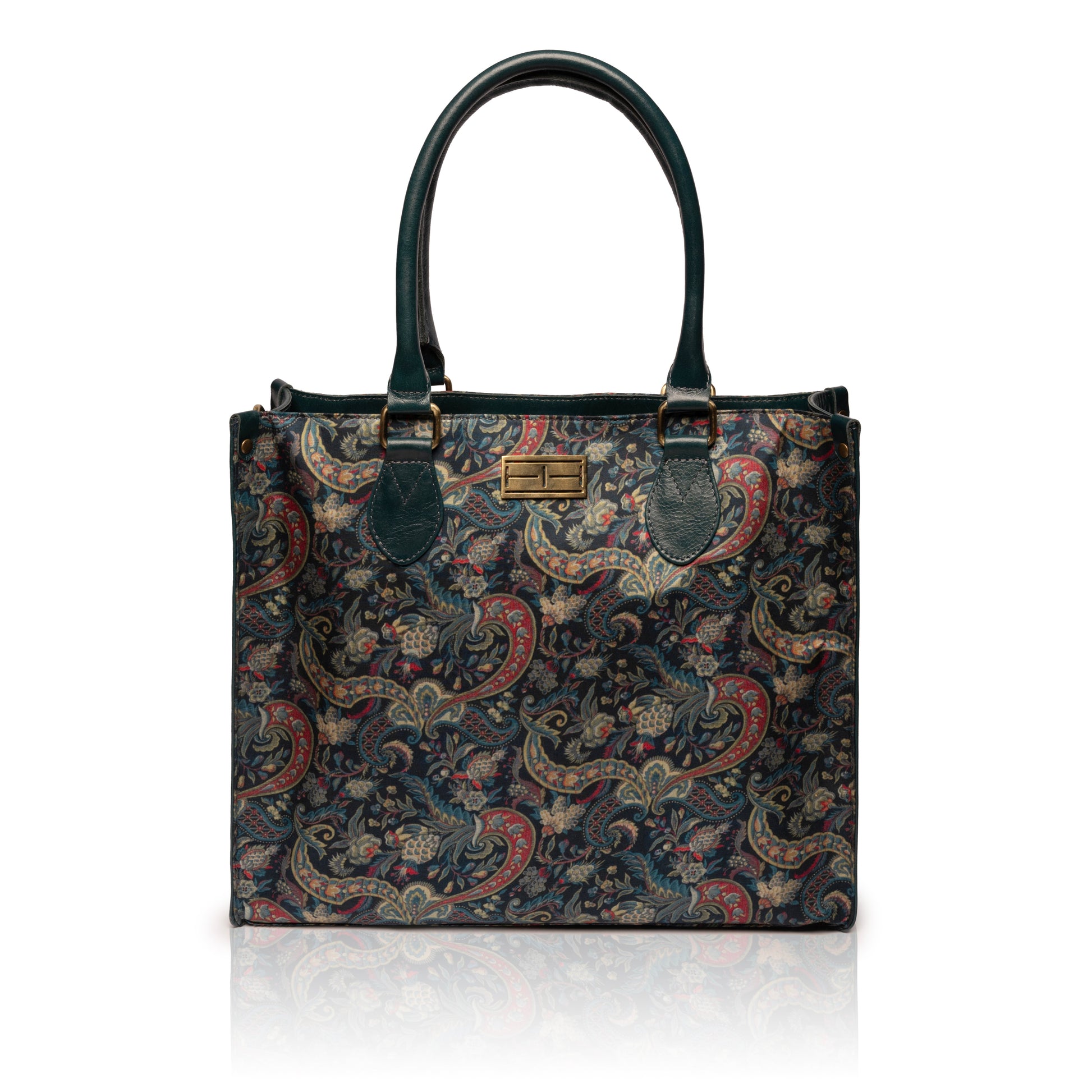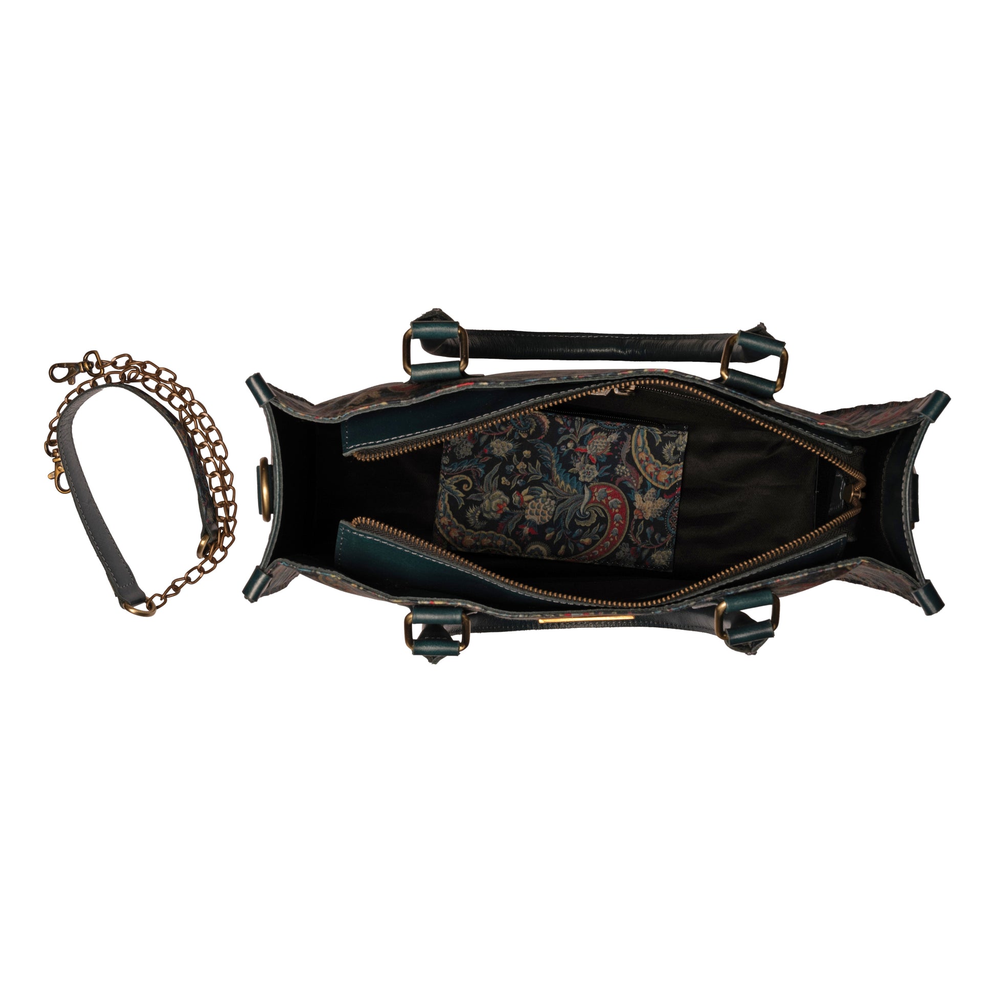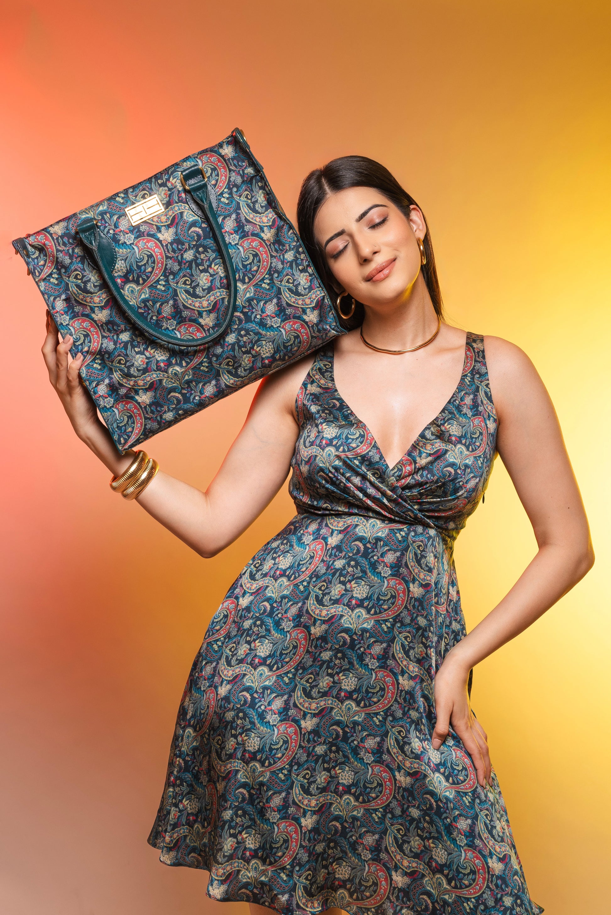 Raise your everyday style with this sophisticated and feather light tote bag, crafted from luxurious modal satin with contrasting leather sides and handle. The bag features a short leather handle for effortless carrying and a chic chain and leather long strap for versatile wear. With a palacial main compartment and two additional pockets, this tote seamlessly blends elegance with functionality, making it an essential accessory for any wardrobe.