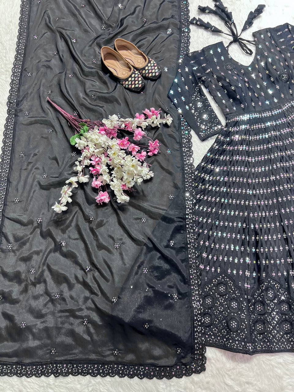*Anarkali Fabric* : Pure Chinon Silk Material With 5mm And 9mm Sequence Embroidery Work With Fancy Full Sleeves & *Kali Cut Pattern Anarkali*