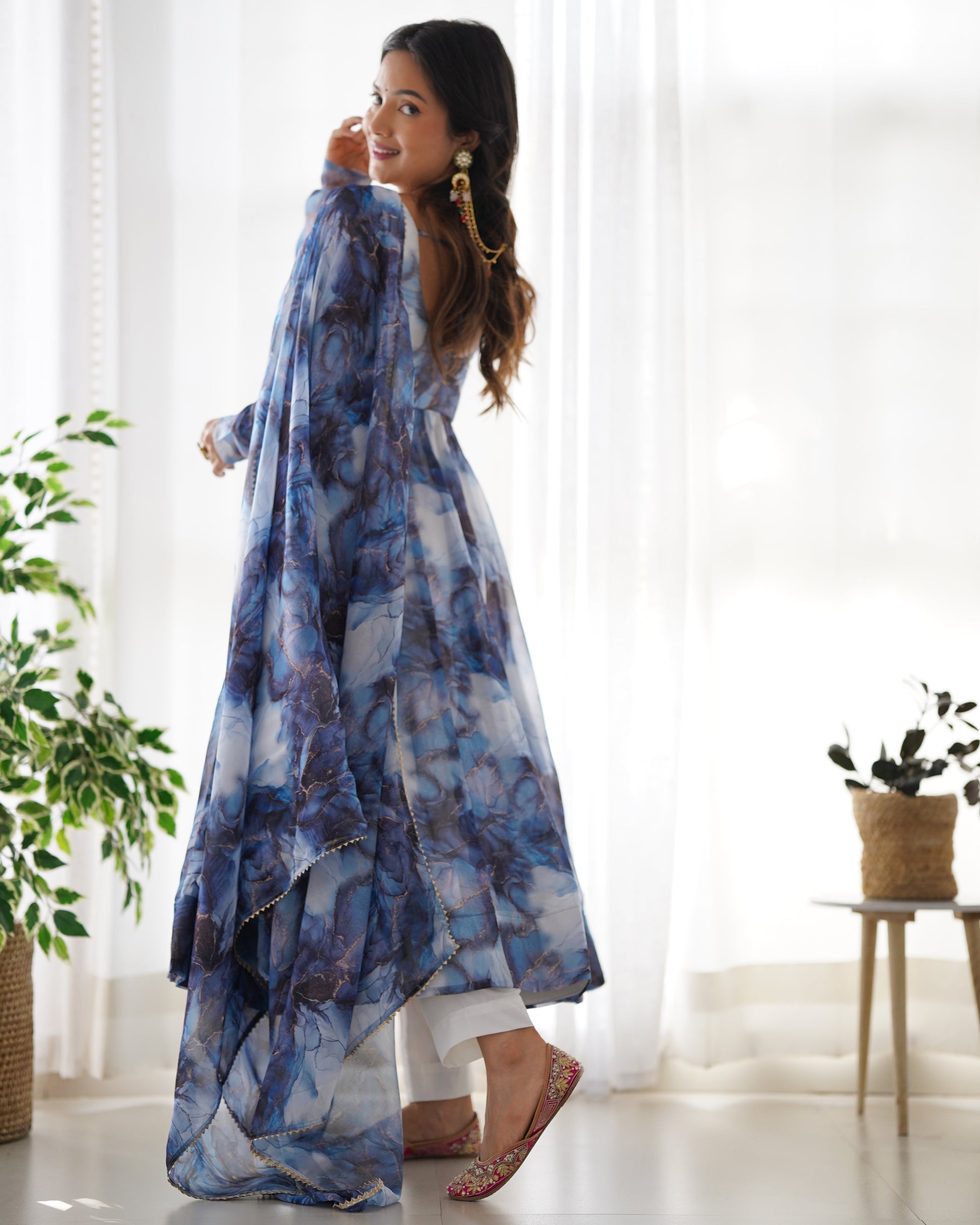 *PURE SOFT ORGANJA SILK MARBLE PRINT FABRIC FULLY FLAIR KALI PATTERN AND CANVAS PATTA WITH DUPPTA SET,PENT READY TO WEAR*