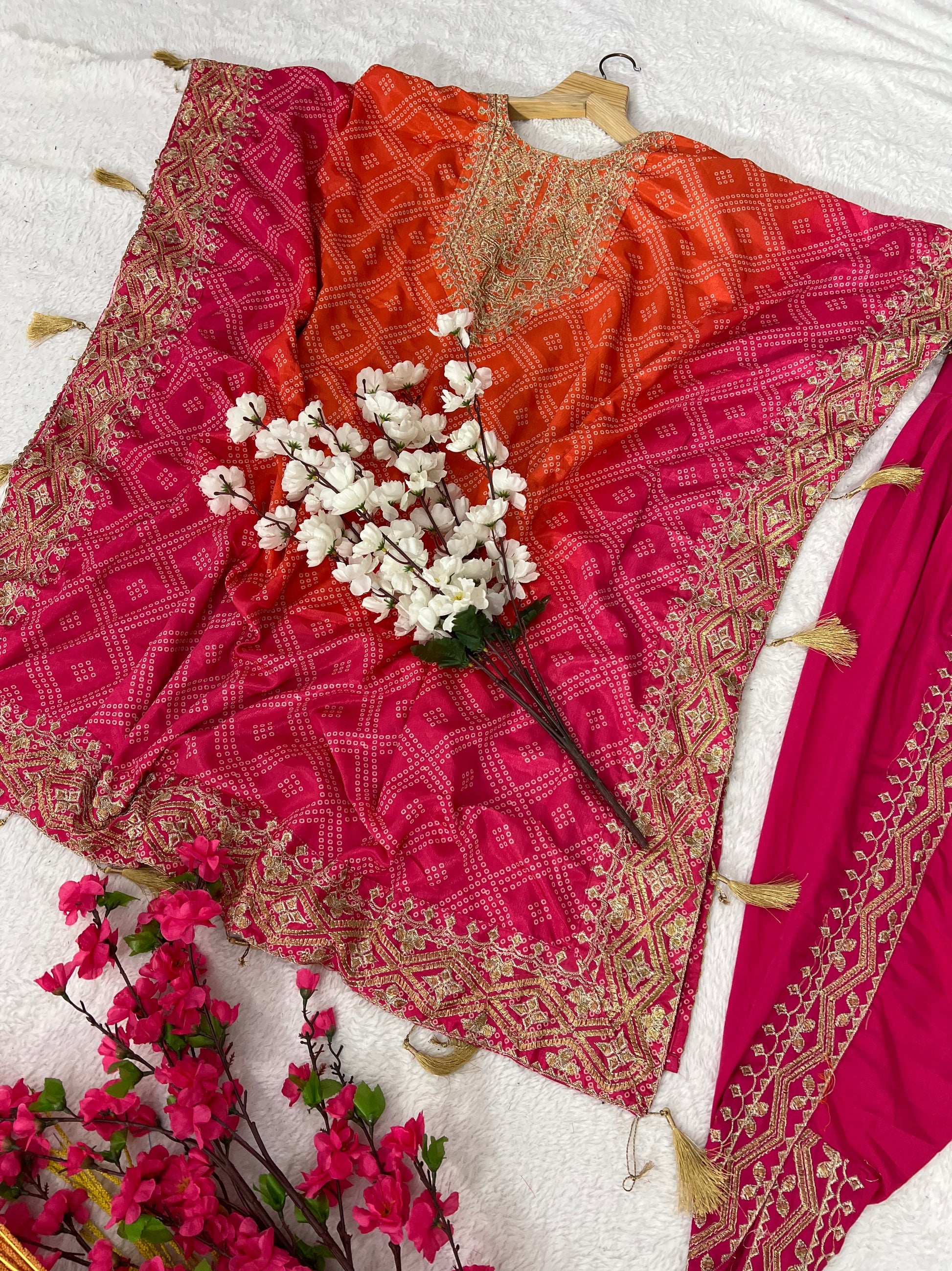 *Kaftan Fabric* :- Pure Chinon Silk Fabric With Digital print and Emb Work Nack and Lace on border With tussel with Micro silk inner (Fully stitched)