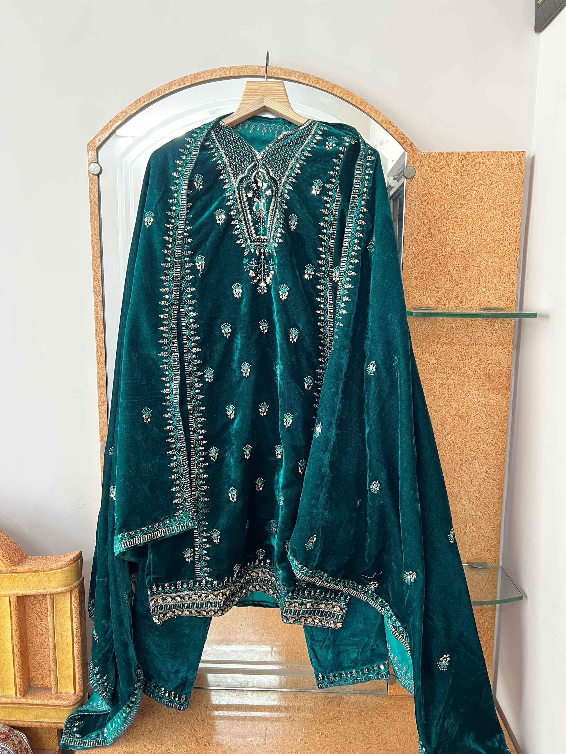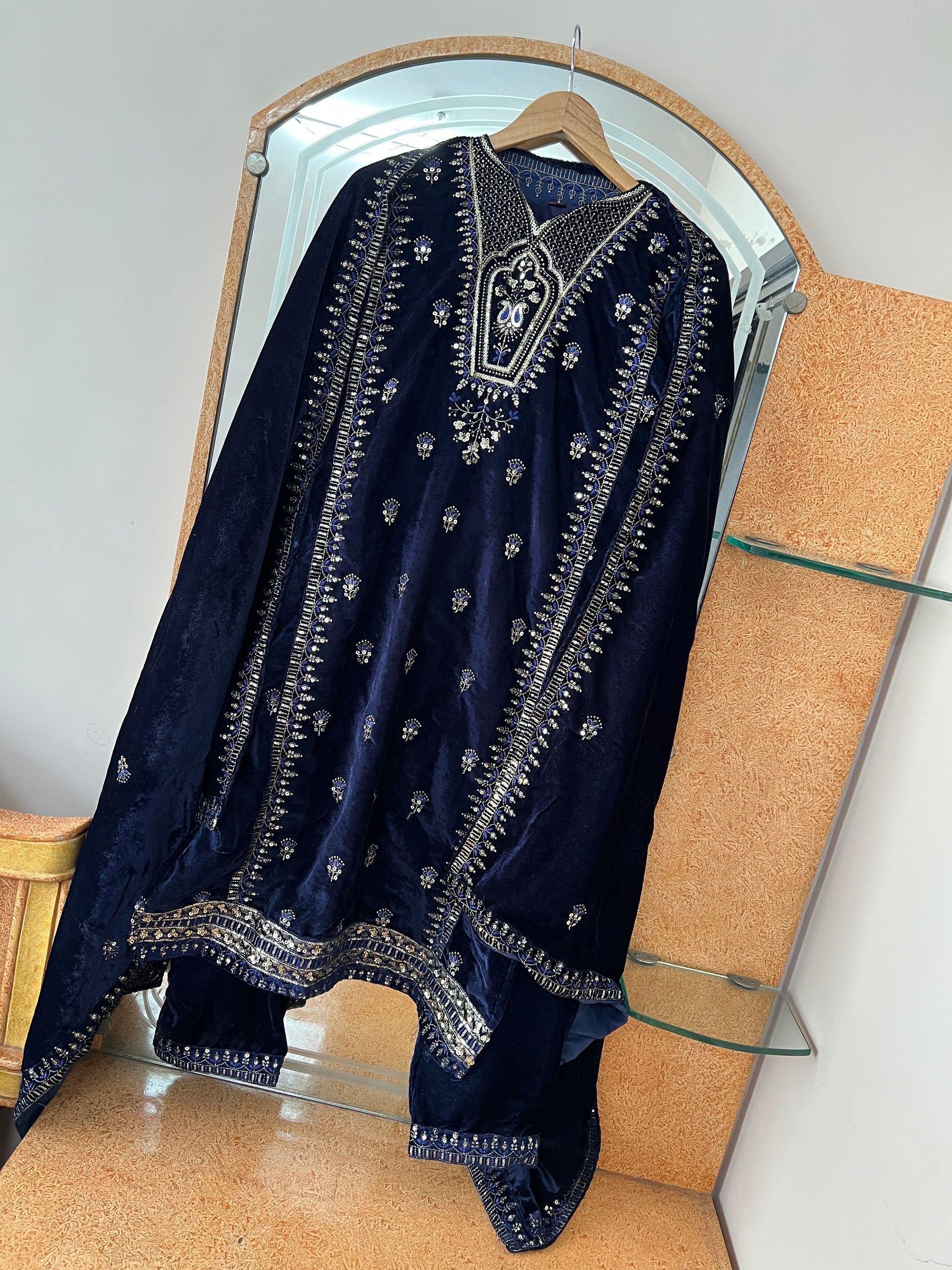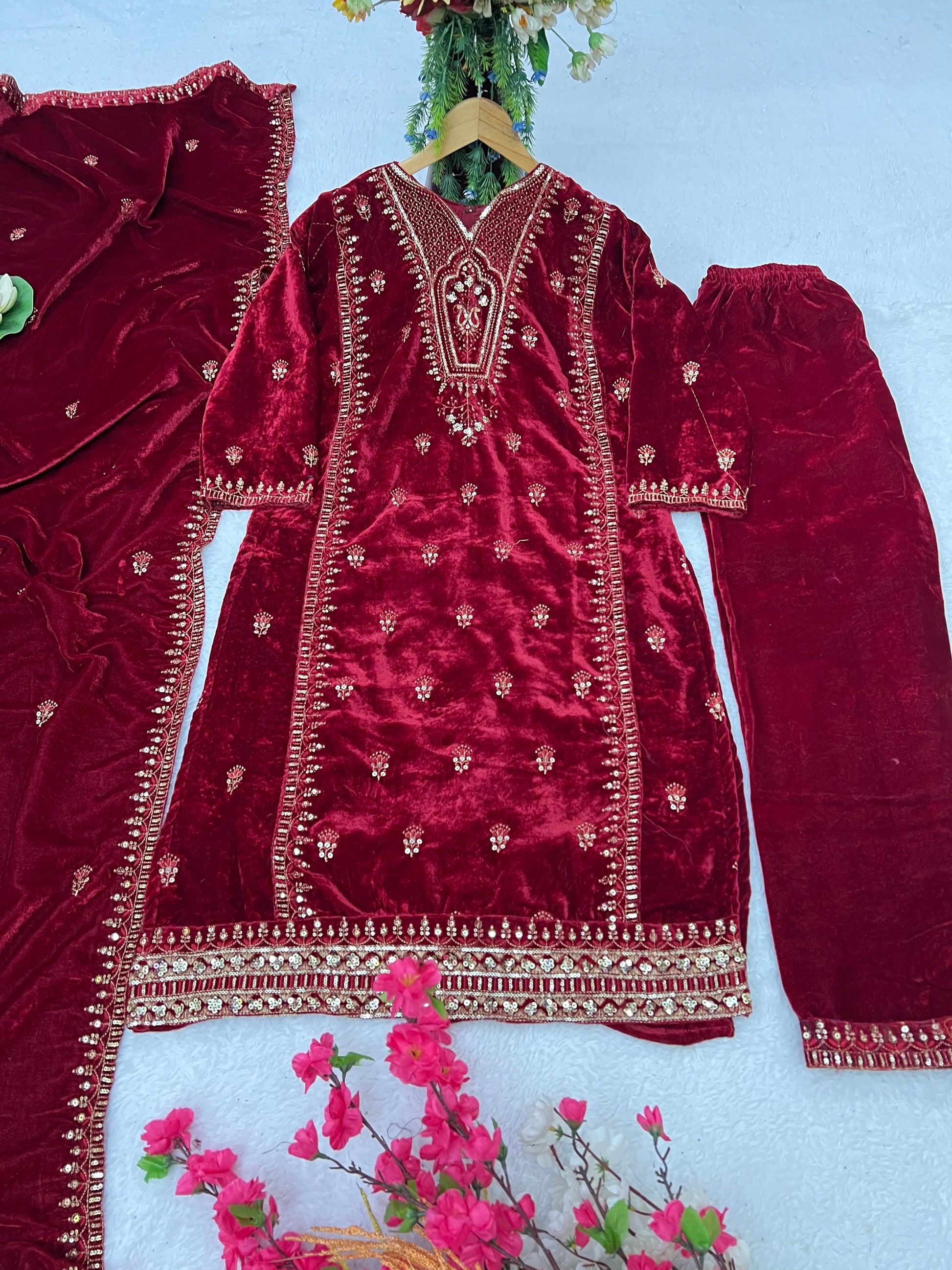 *Bottom Fabric*:- pure Viscose Velvet Silk Fabric Pant with 40 Inch Length (Fully stitched)