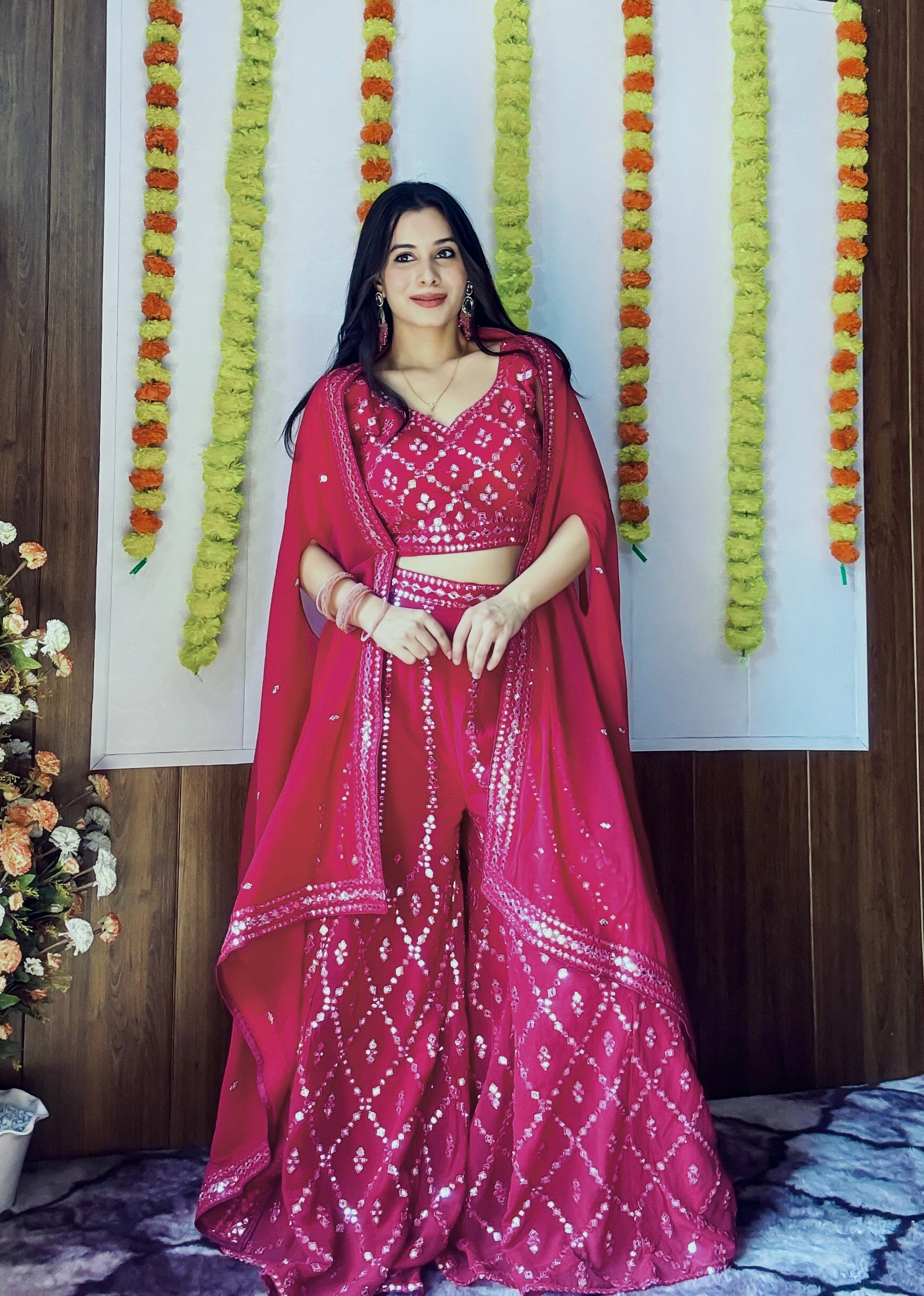Georgette plazo with foil mirror work & thread work all over