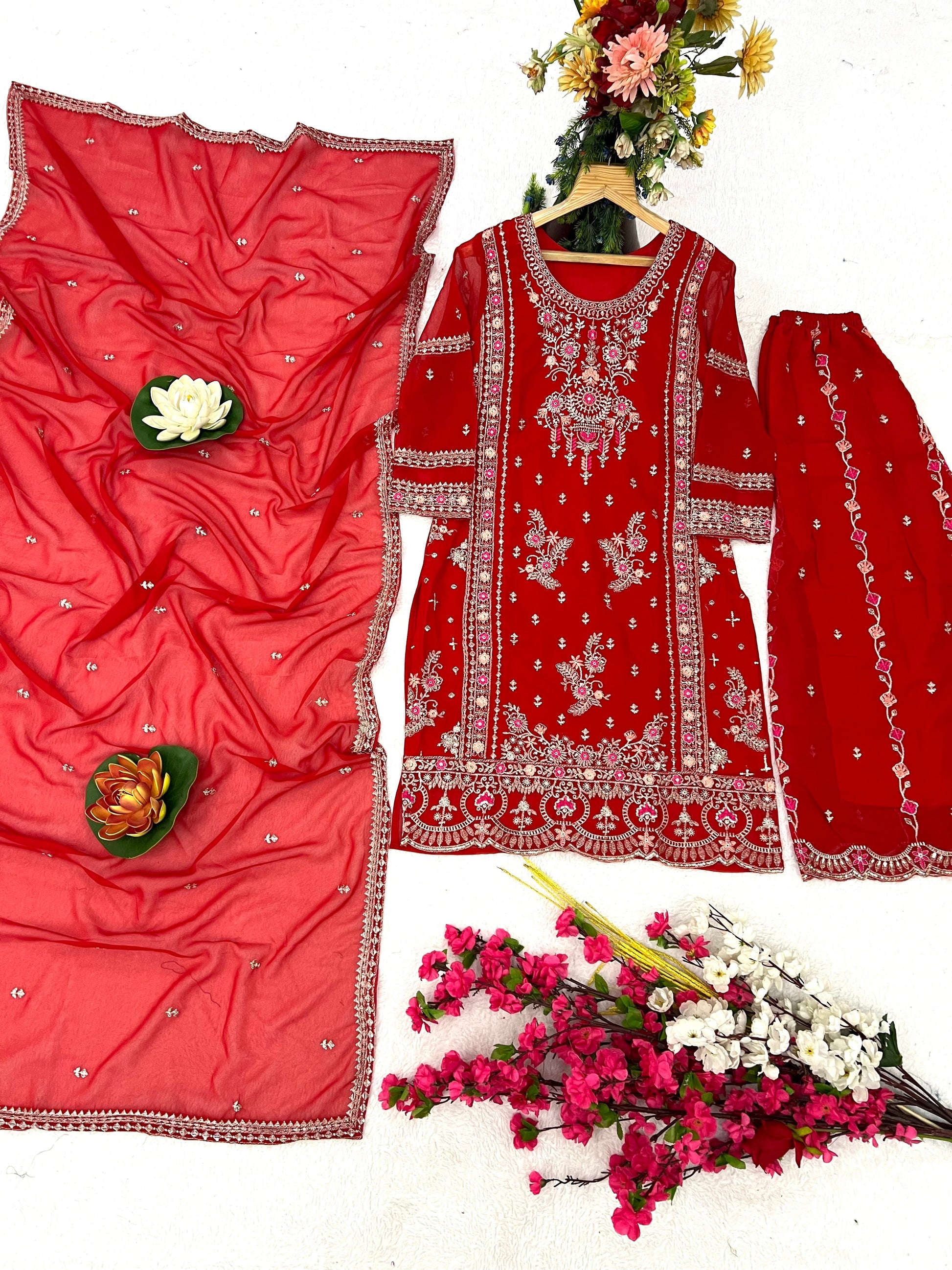 *Gajari and red Coloured Embroidered Attractive Party Wear Kurti plazzo pair has a Regular-fit to customer*