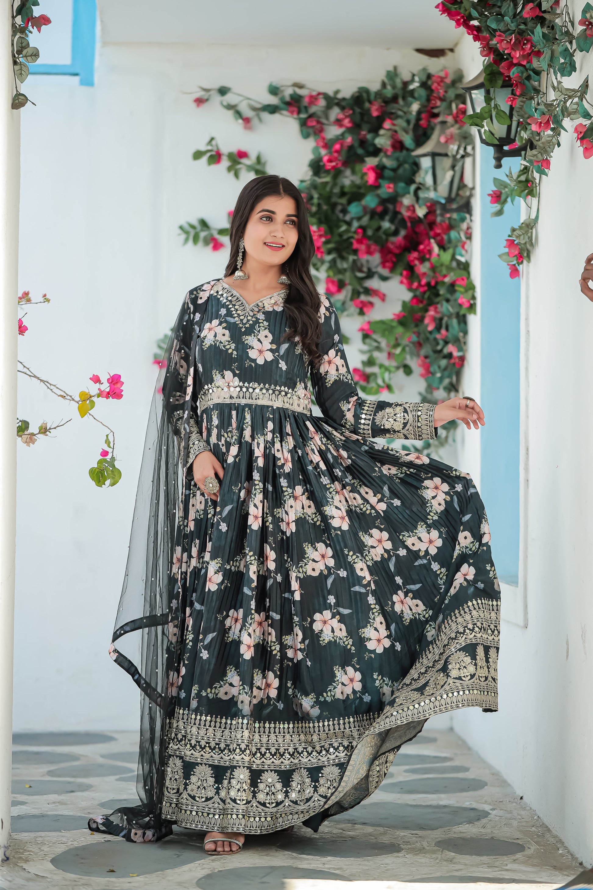*Gown Fabric* :Heavy Crush Pleating Chinon Silk With Digital Print With Embroidery 5 mm Sequence Work With Full Sleeves With *Cups*