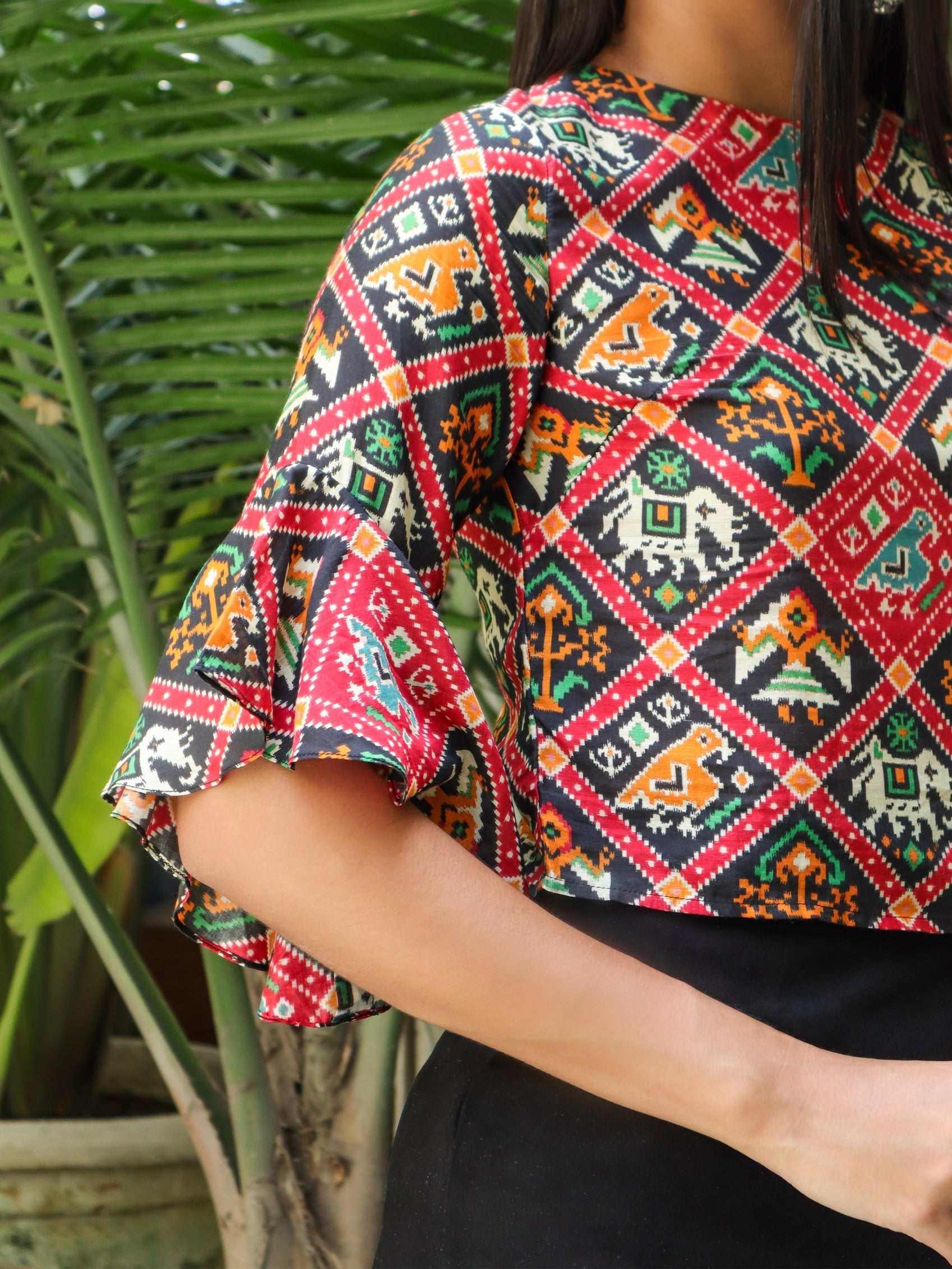 Elegant and playful, Patola matrix top features a round neck, ruffled 3/4 sleeves, and a charming design. Perfect for a casual yet stylish look.