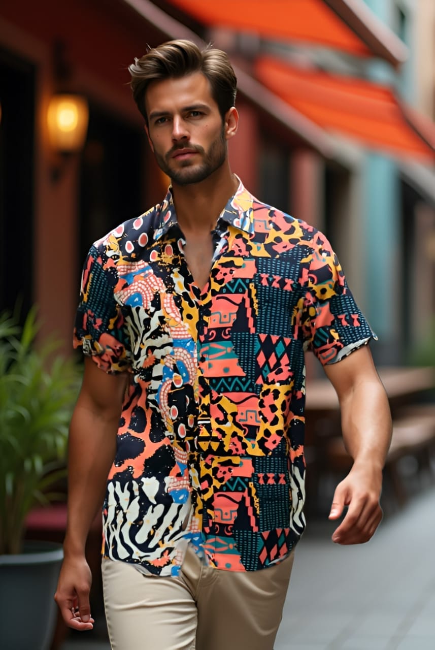 bold and vibrant abstract tribal motifs print shirt, a statement piece. relaxed fit, this half sleeve shirt features a front-open button closure. Perfect for vacations, or laid-back weekends.