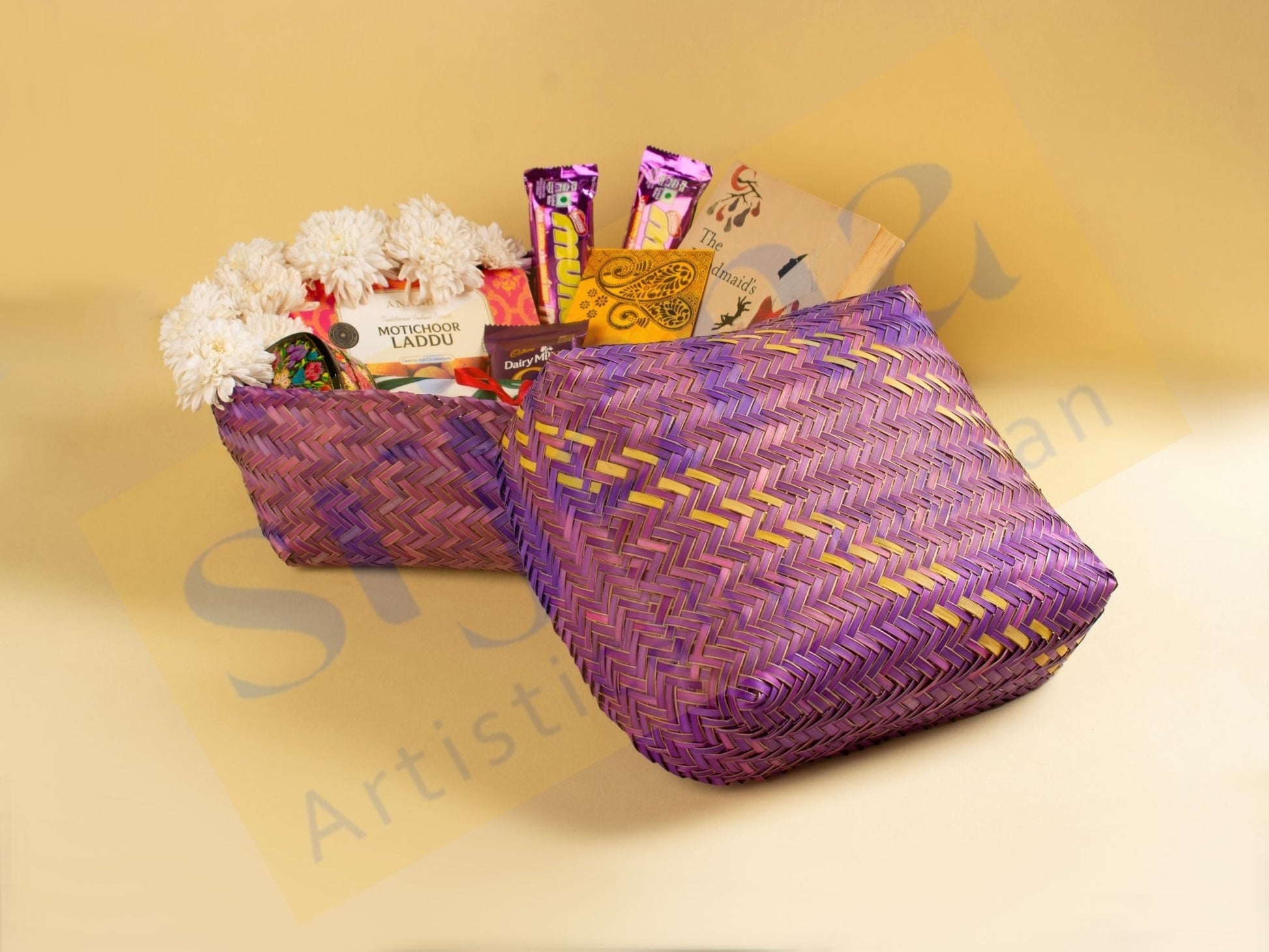 Organize your space with this handcrafted Sitalpatti square basket, woven from natural fibers known for their strength and cooling properties. Featuring a vibrant blend of purple, pink, and golden hues, this basket adds a charming rustic touch to your home while offering practical storage for essentials. Lightweight yet sturdy, it’s perfect for organizing small items, gifting, or adding an artisanal flair to your decor.