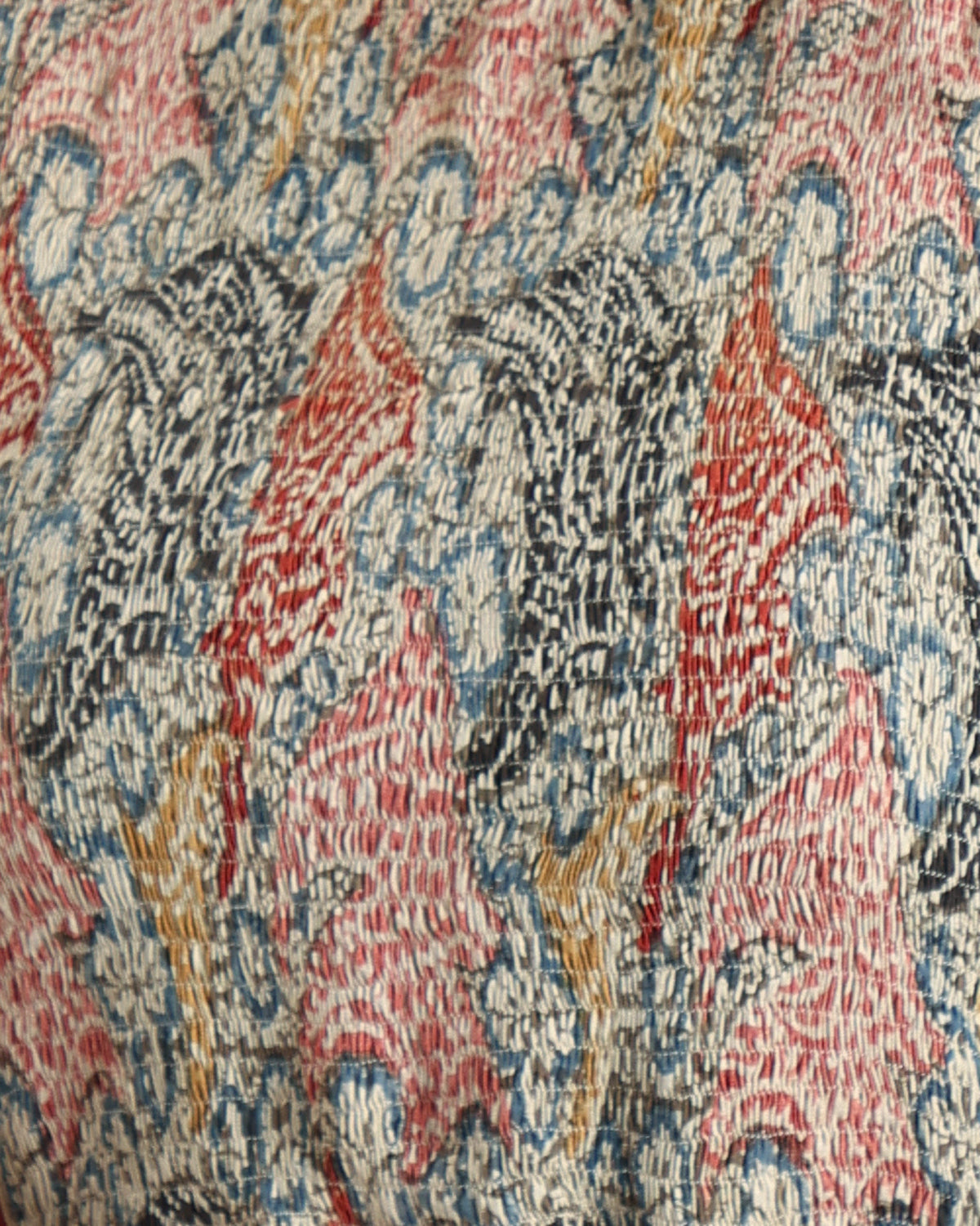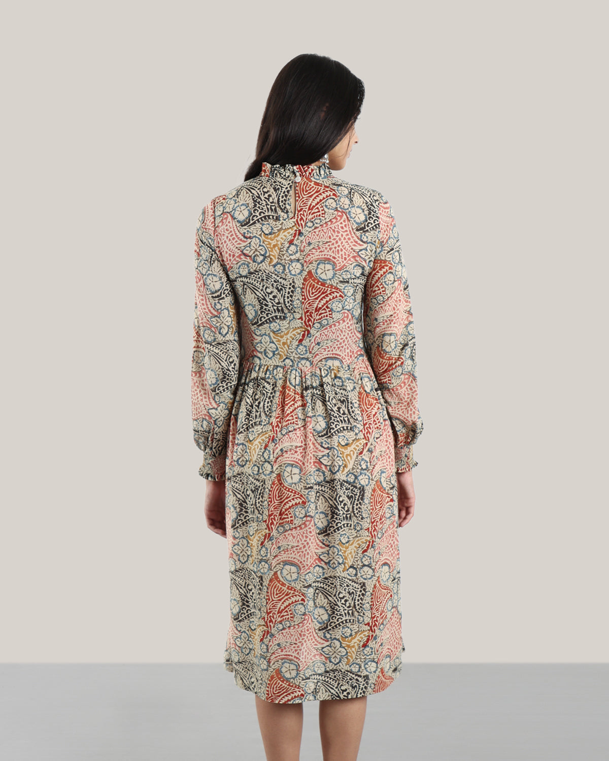 Smocked tango dress with a closed neck, full, voluminous sleeve, and gathered waistline in mul mul inspired by the English fashion, Smocking.