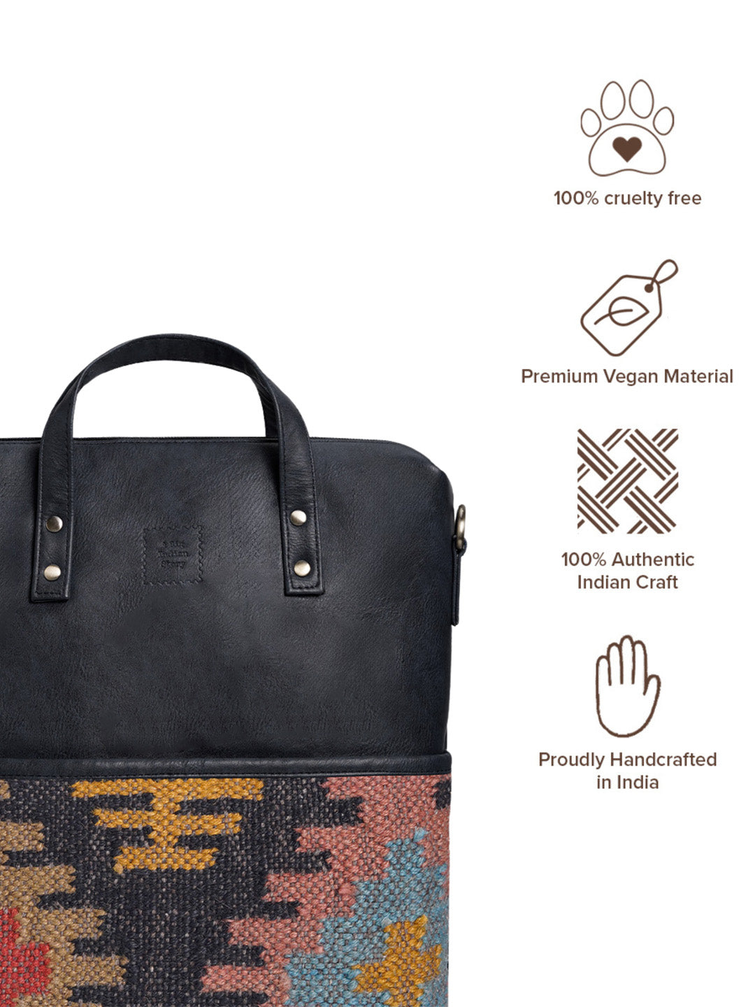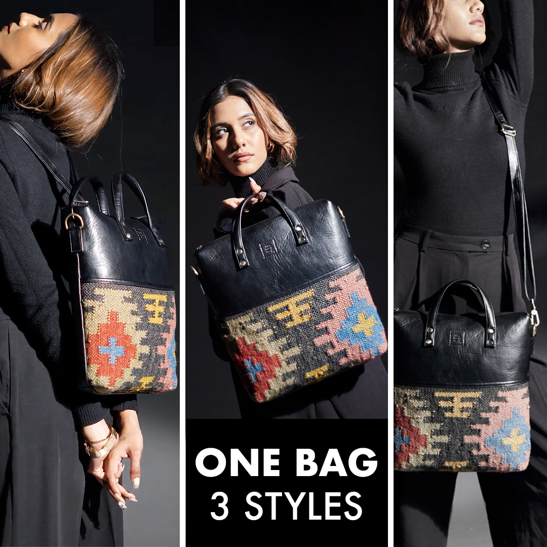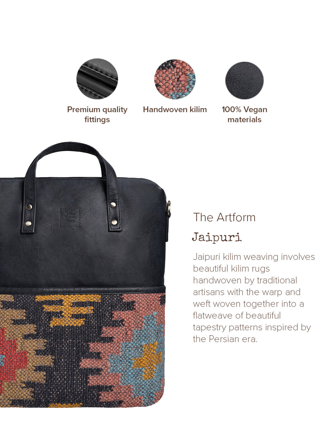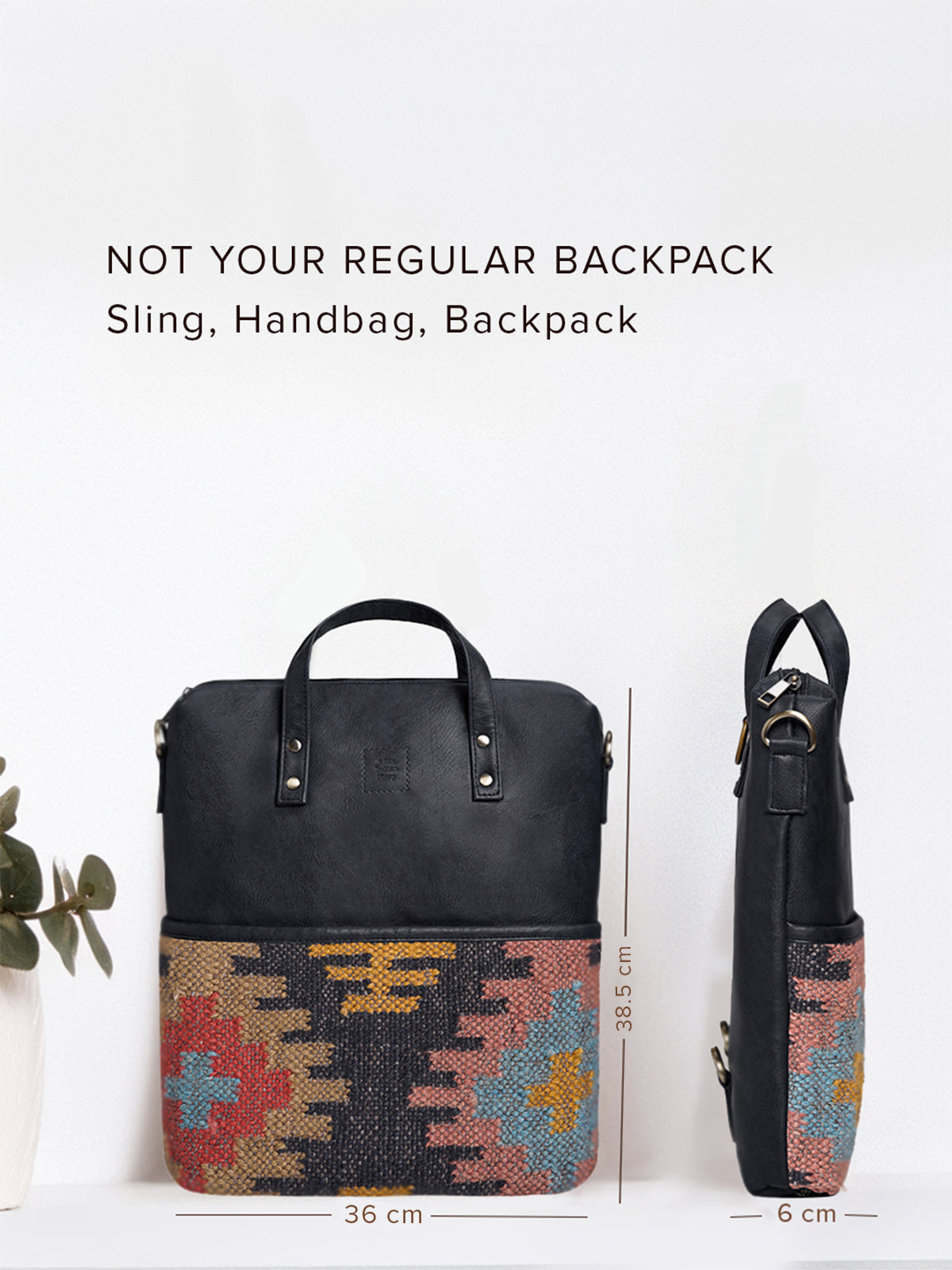 One of our signature bestselling bags, the ABIS convertible is the perfect accessory for a woman or man on the go. This convertible bag in Black Vegan Leather with a striking handwoven Jaipuri kilim. Daytime backpack, office tote or a weekend sling - pick your mode and just adjust the straps as you like. Cool hmm :) comfortably fits a sleek 16 inch MacBook pro or a similar sized laptop.