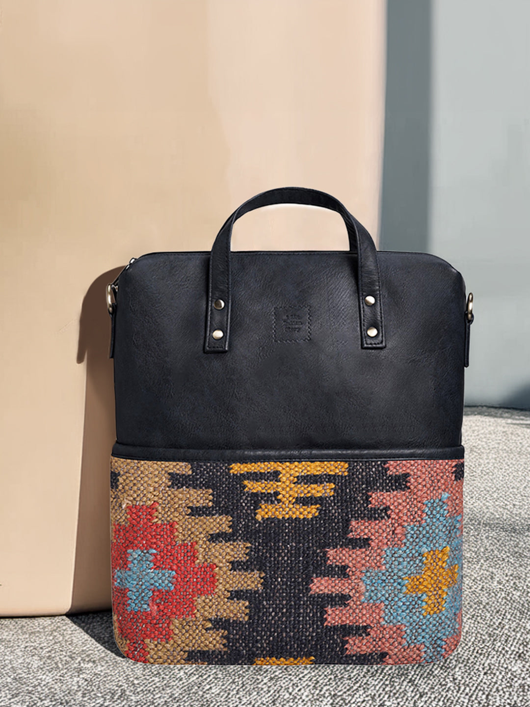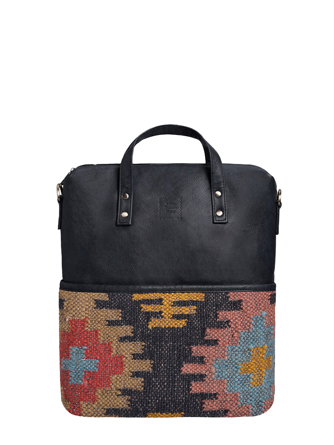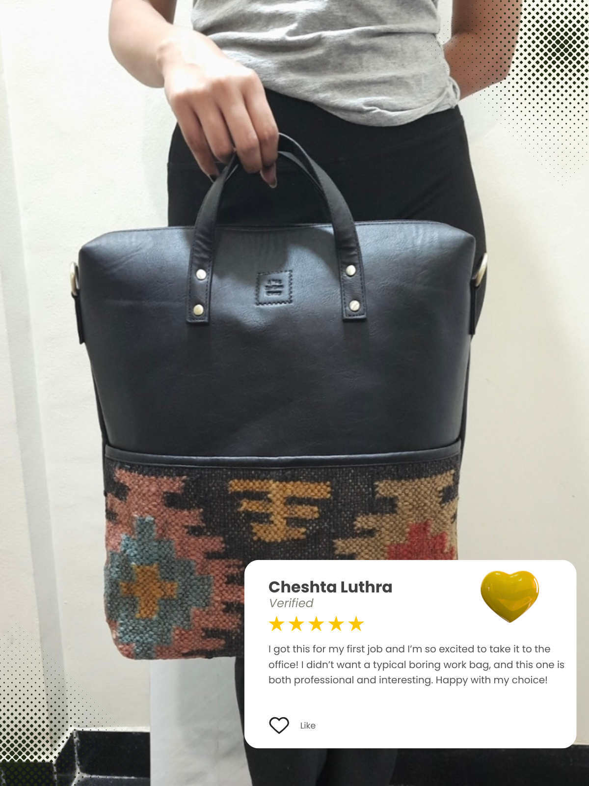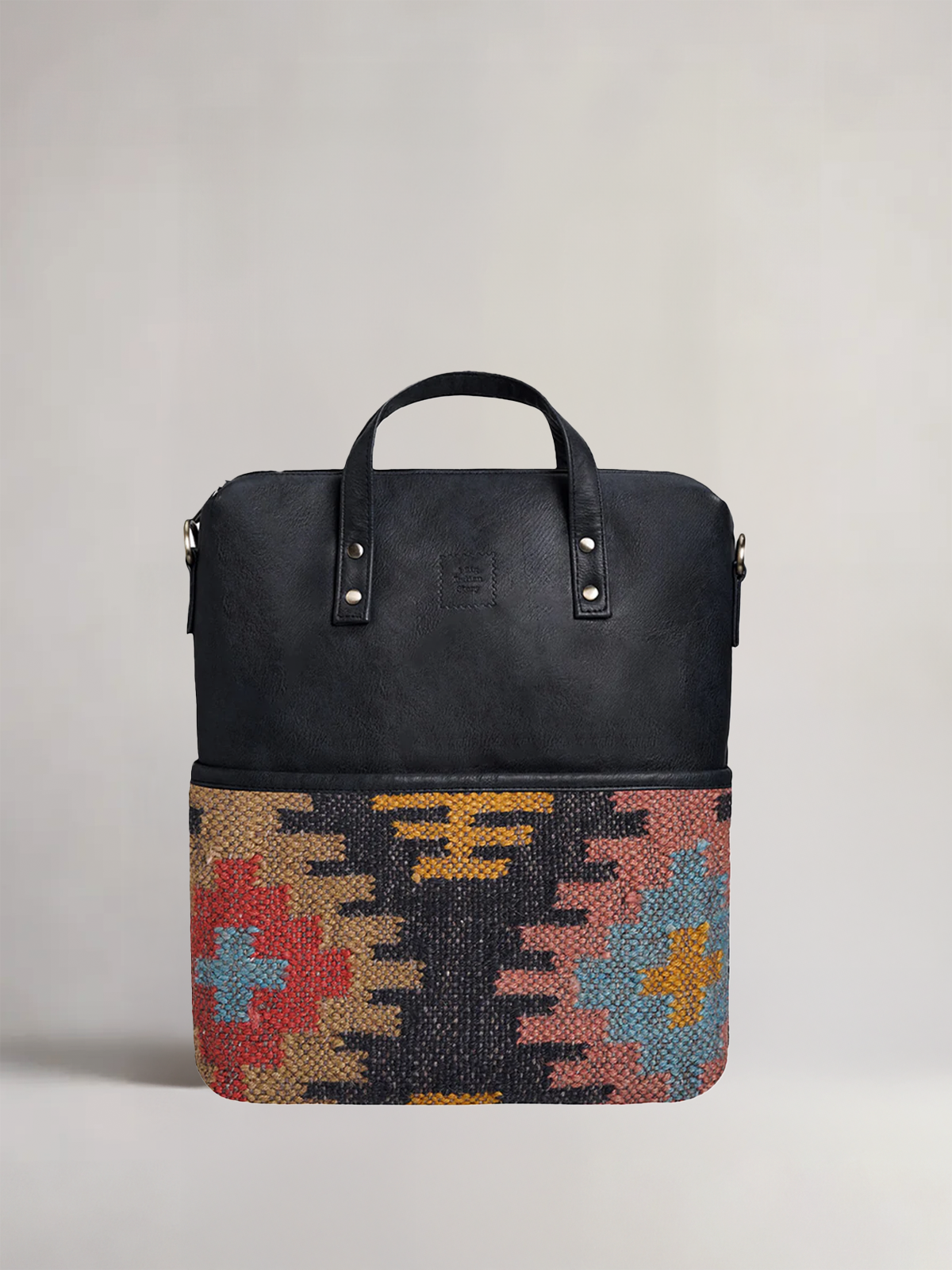One of our signature bestselling bags, the ABIS convertible is the perfect accessory for a woman or man on the go. This convertible bag in Black Vegan Leather with a striking handwoven Jaipuri kilim. Daytime backpack, office tote or a weekend sling - pick your mode and just adjust the straps as you like. Cool hmm :) comfortably fits a sleek 16 inch MacBook pro or a similar sized laptop.