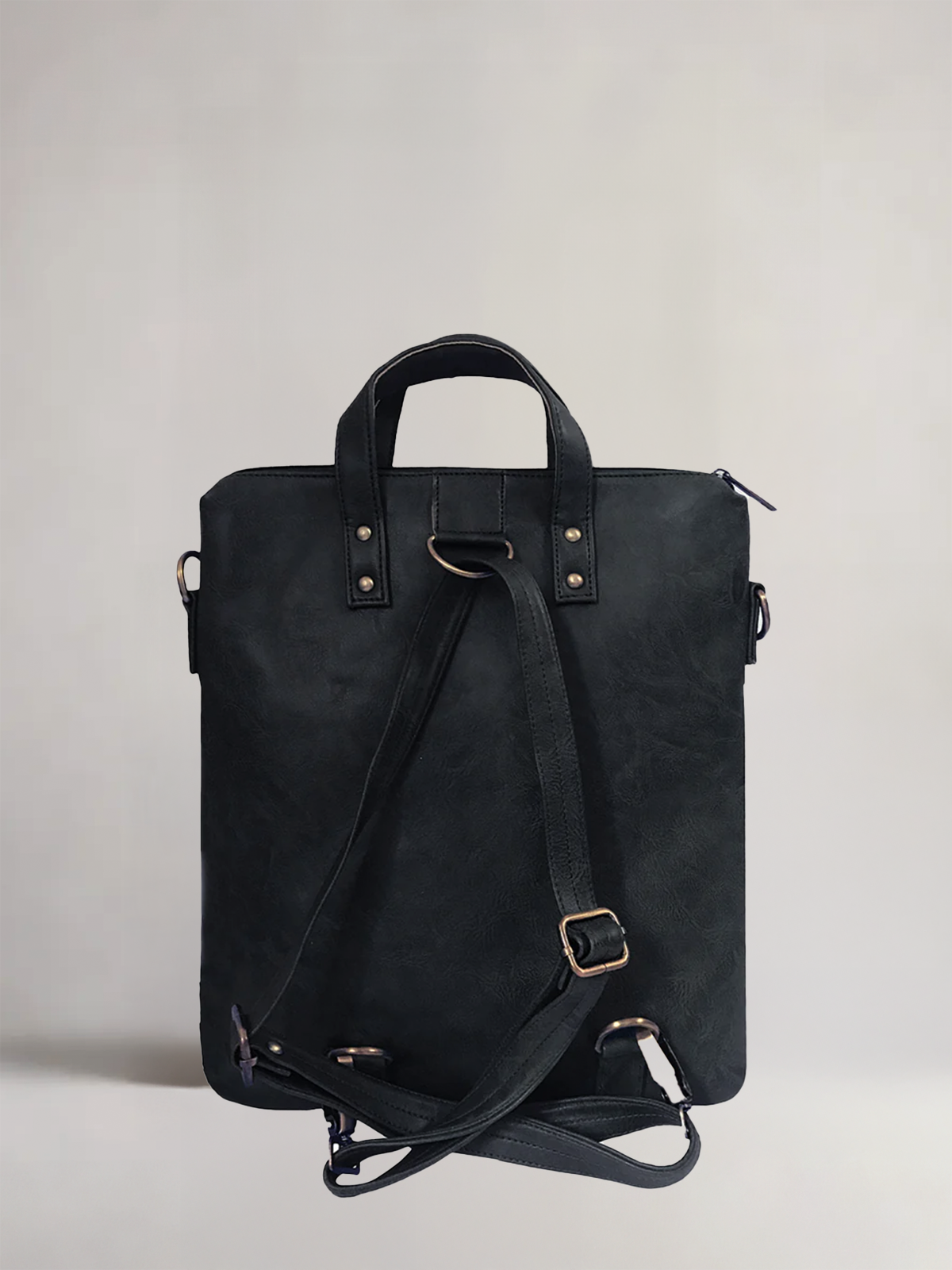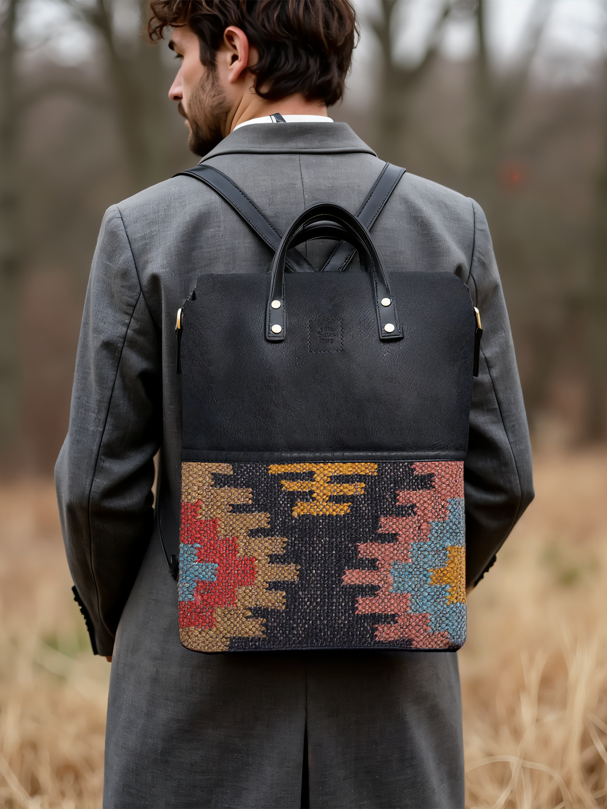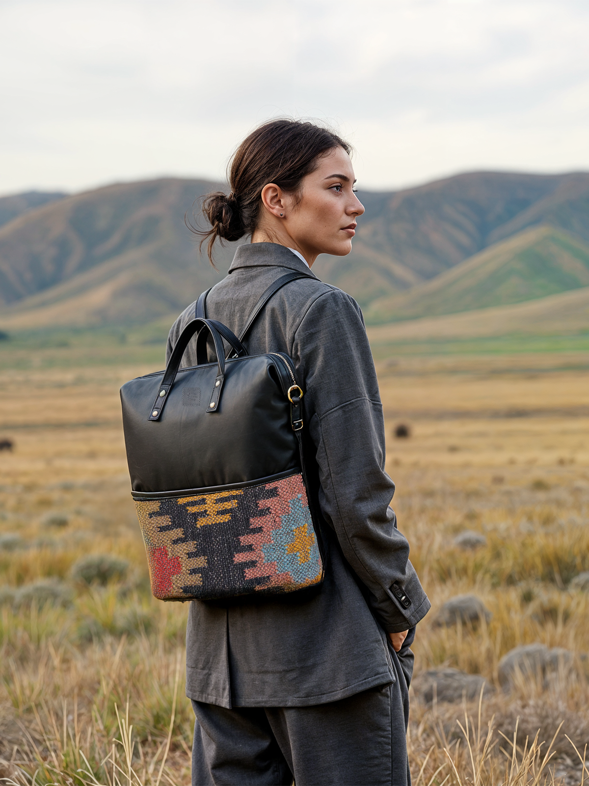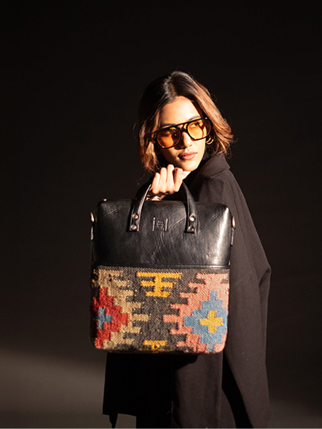 One of our signature bestselling bags, the ABIS convertible is the perfect accessory for a woman or man on the go. This convertible bag in Black Vegan Leather with a striking handwoven Jaipuri kilim. Daytime backpack, office tote or a weekend sling - pick your mode and just adjust the straps as you like. Cool hmm :) comfortably fits a sleek 16 inch MacBook pro or a similar sized laptop.