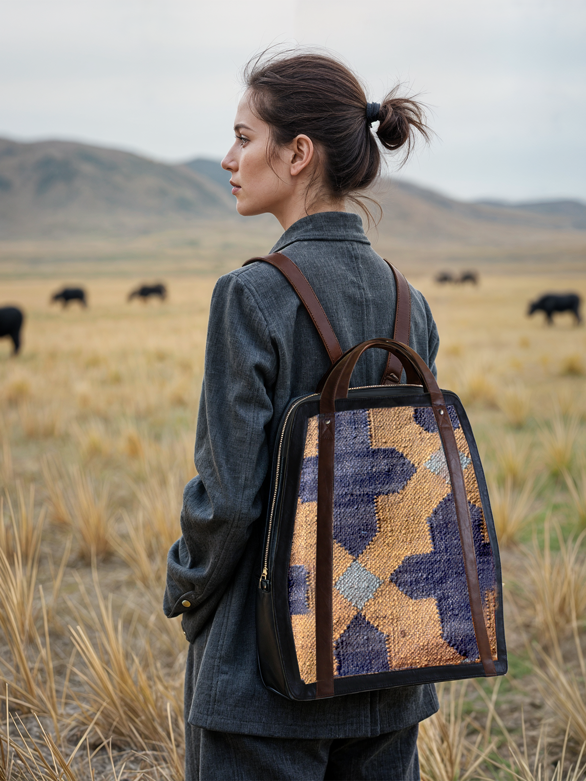 Material: Vegan Leather, Cotton Kilim and Canvas lining