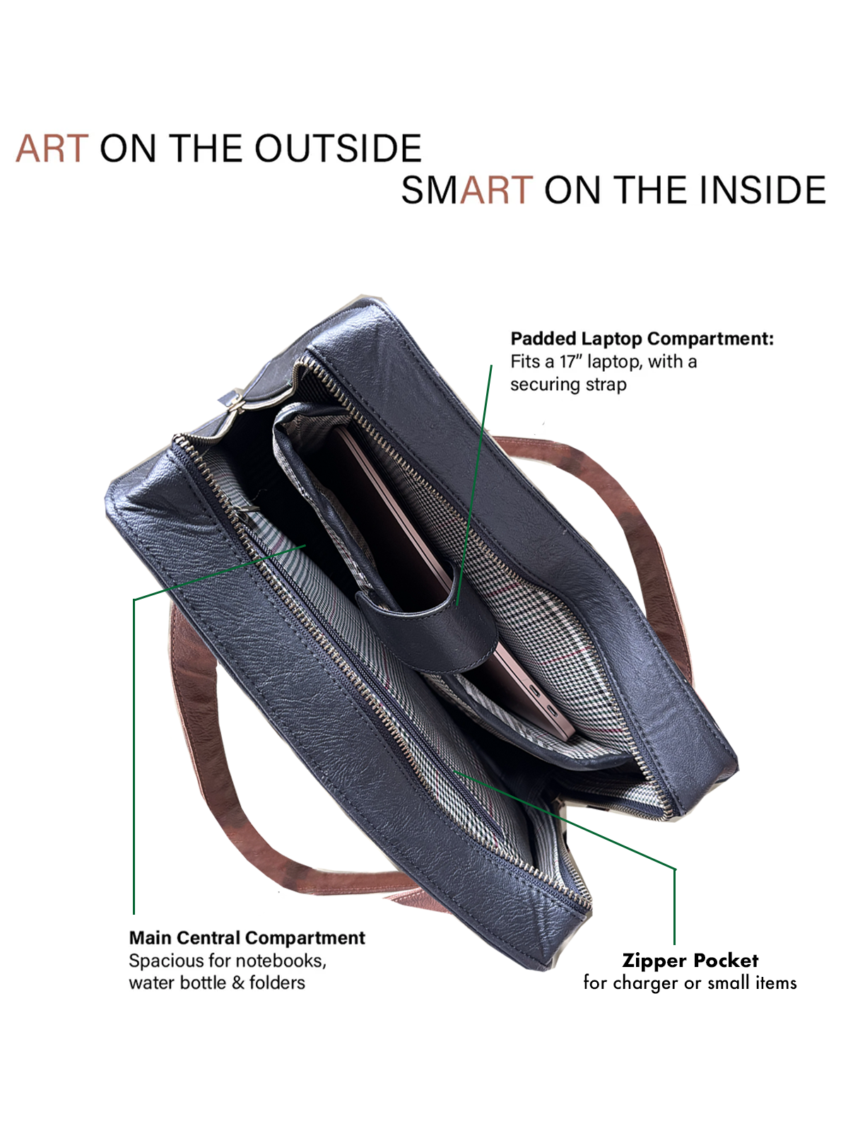Product Details: 1 zipper closure, secure laptop compartment and 1 zipper pocket inside. 1 zipper pocket on the back side.