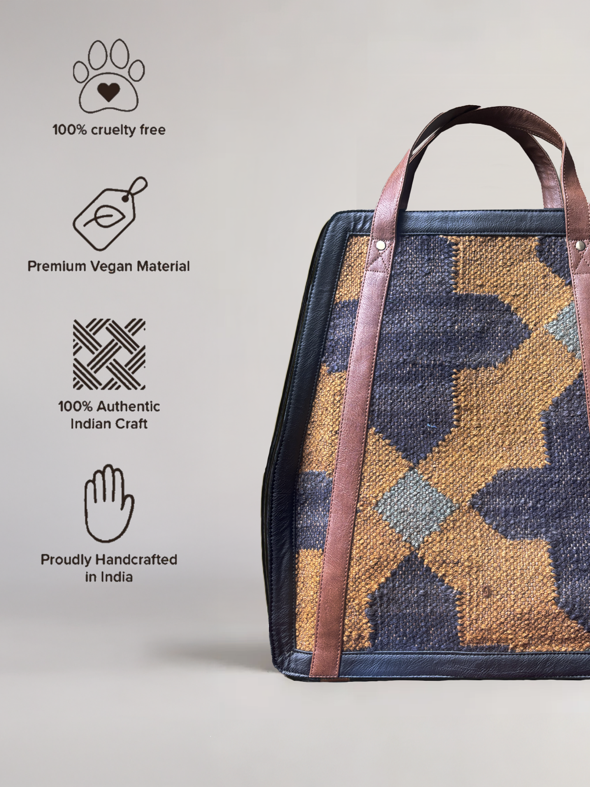 Get your exclusive structured tote now! A striking briefcase style structured tote bag in black vegan leather and a beautiful stonewashed, one-of-a-kind, handwoven Jaipuri kilim. Carry this statement bag to work paired with smart Western wear or with fusion wear. Based on customer feedback, we have now modified the straps of this bag to allow you to use it three ways. The adjustable straps transform it into a handbag or a backpack or a crossbody sling. Fits a Macbook or a similar laptop upto 16 inches.