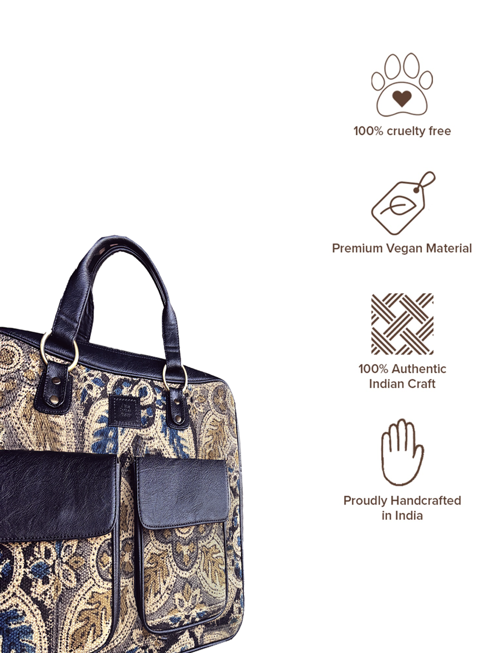 From our signature Kalamkari collection....another stunning laptop traveller this time in black. Features a Kalamkari kilim and black vegan leather. It fits up to a 17 inch laptop plus a few more of your essentials. It has a detachable sling strap and a trolley sleeve on the back that helps you conveniently fit the bag on your stroller suitcase. Great for work, college or your next trip.