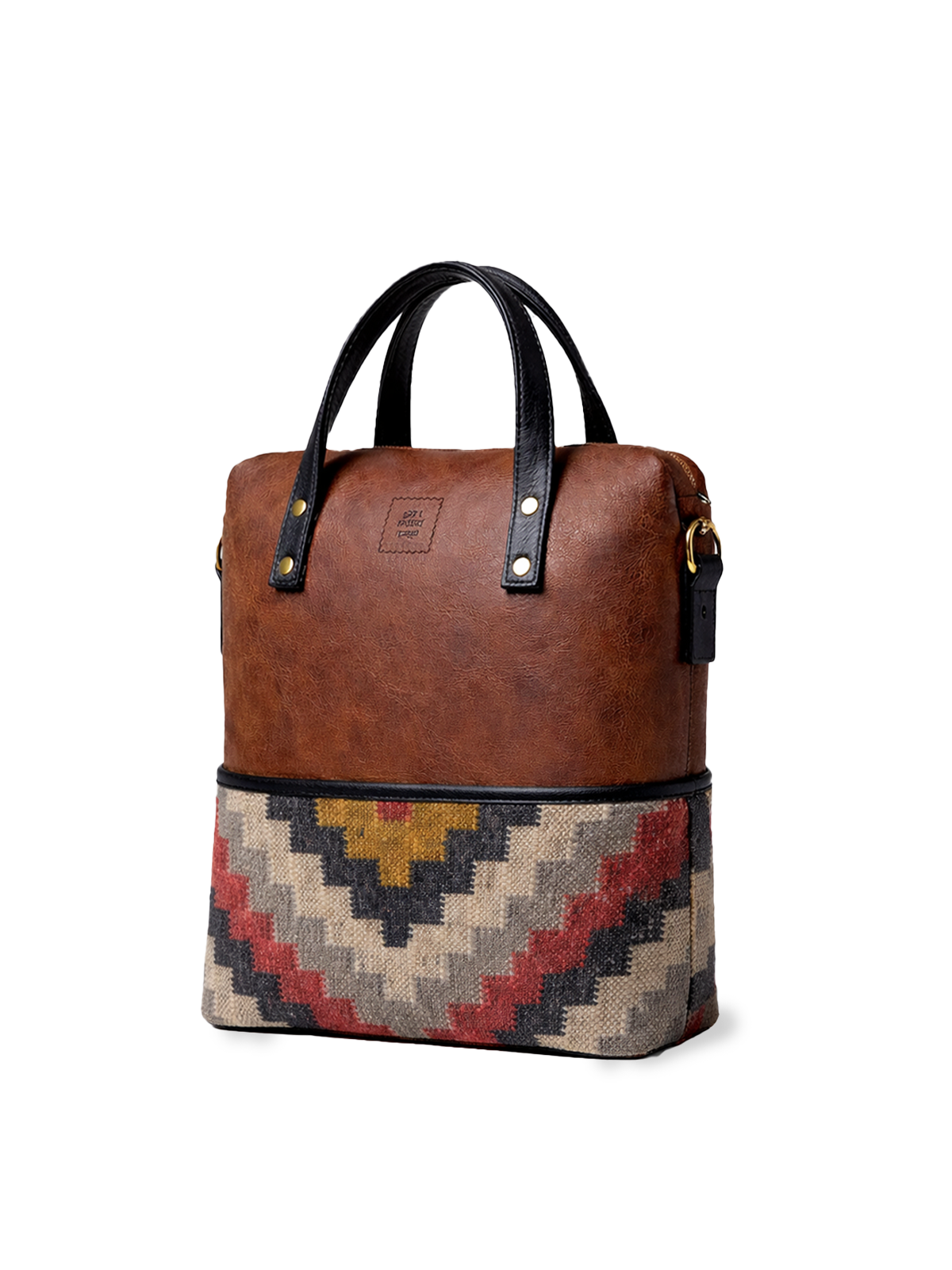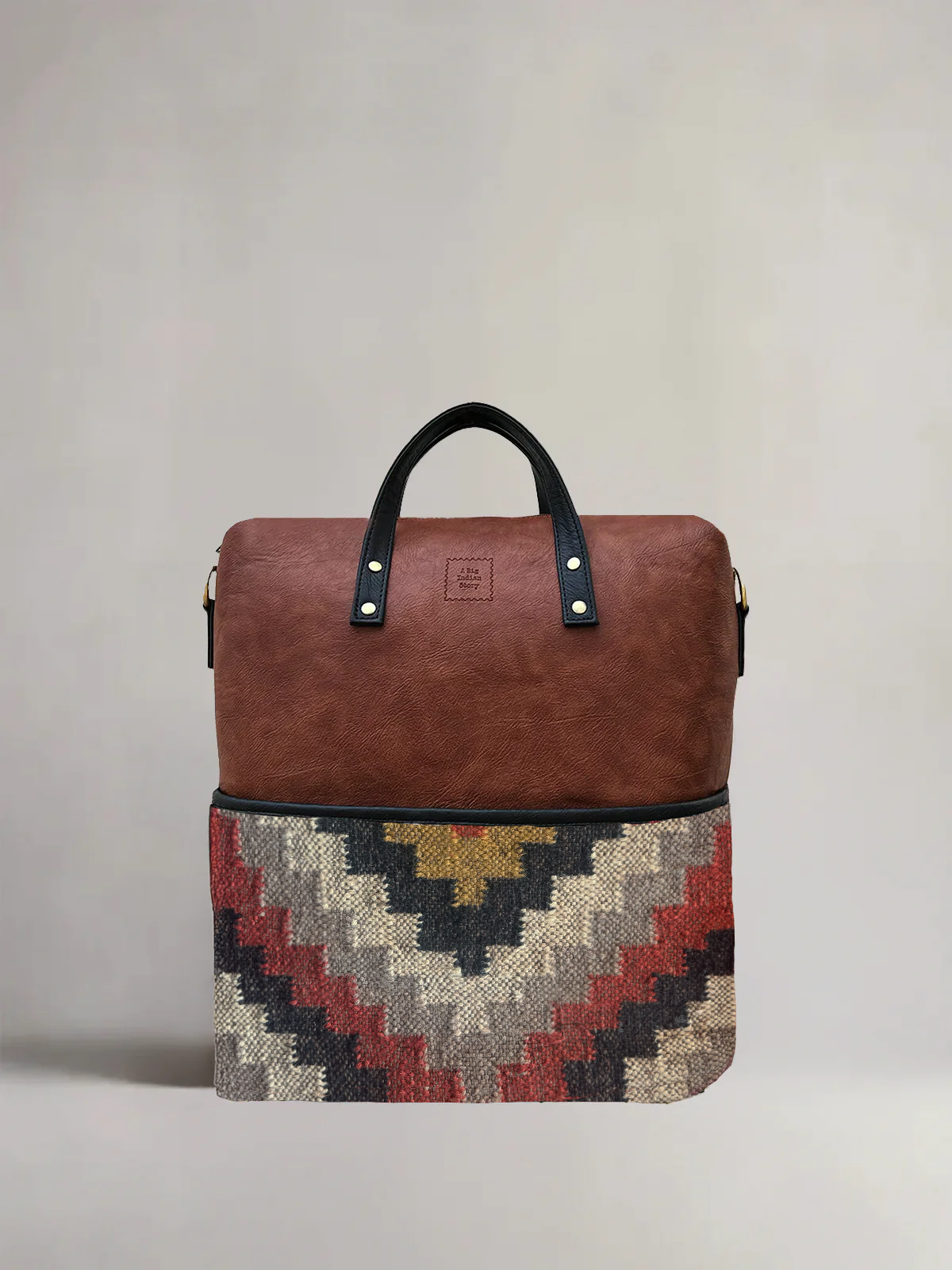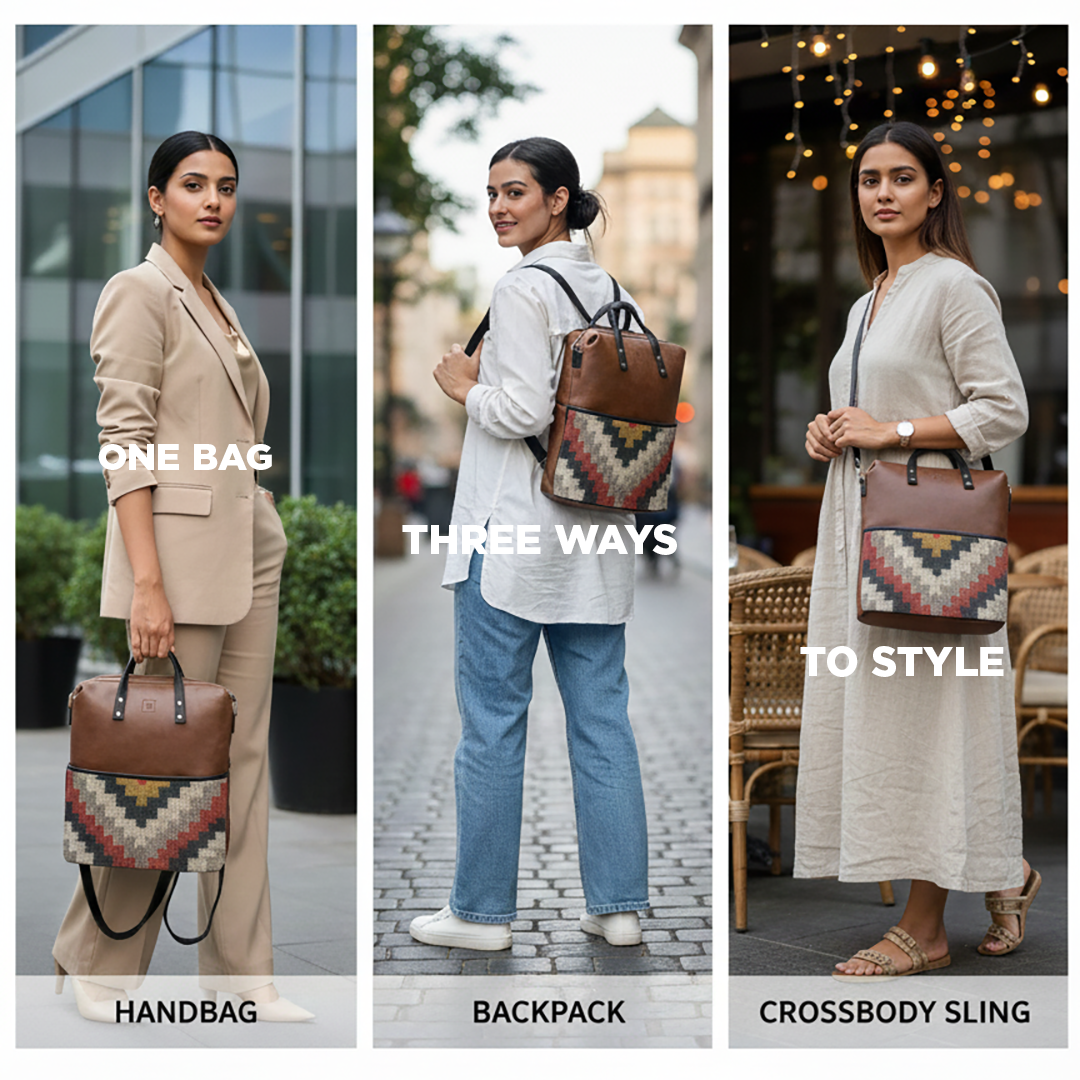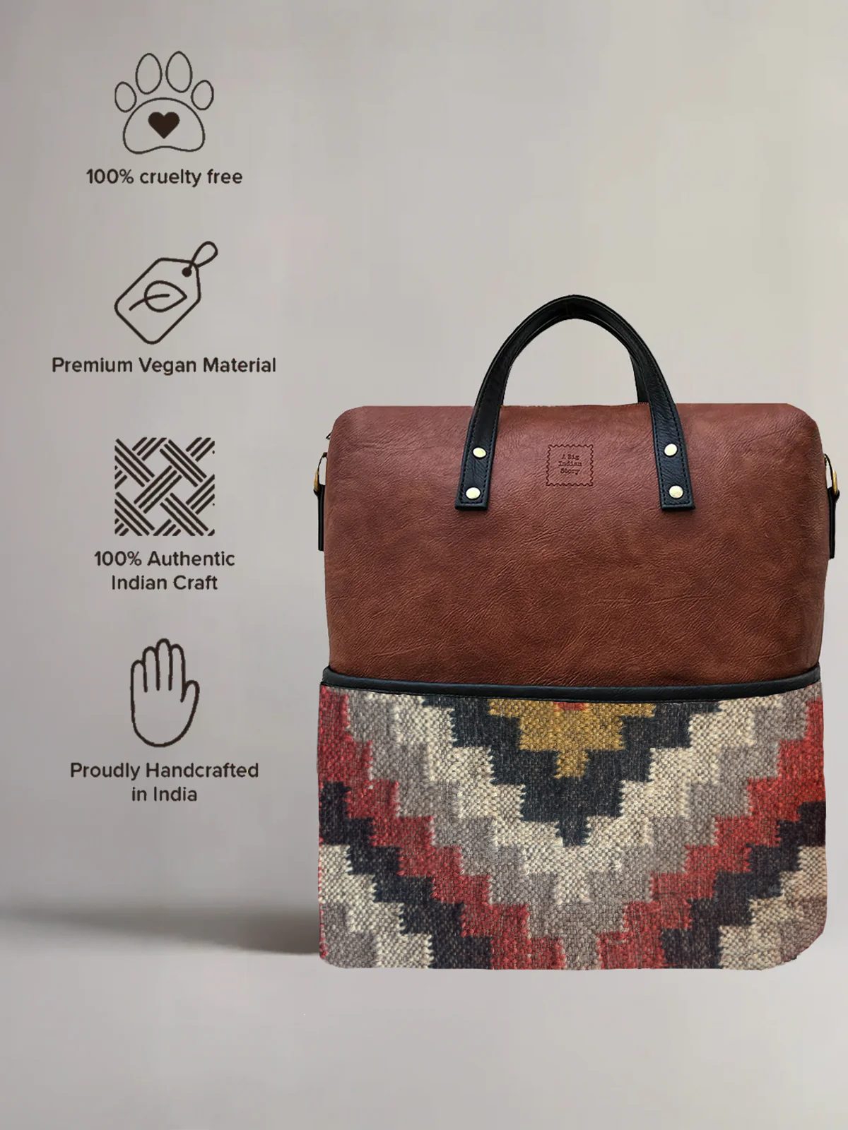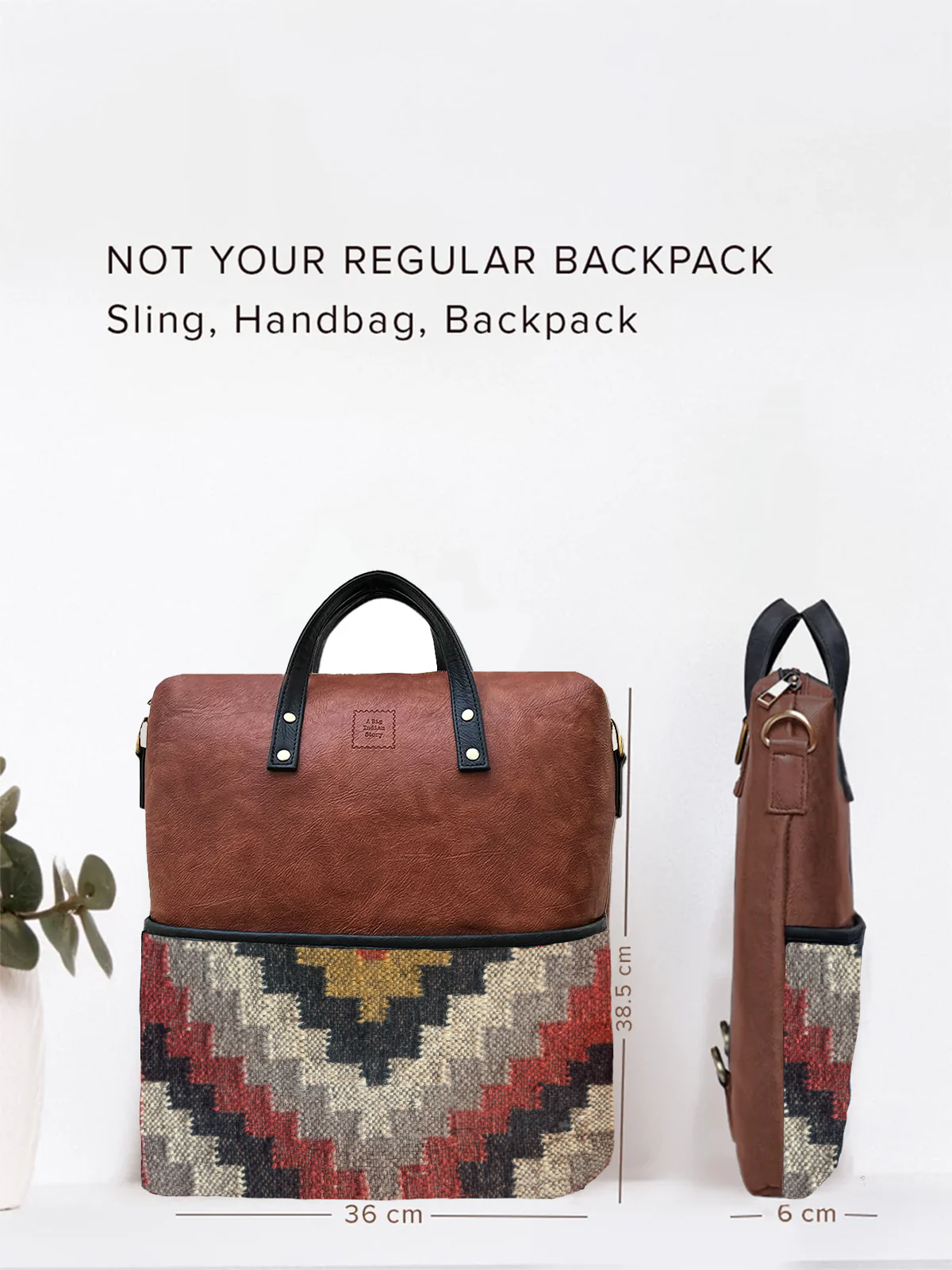 New launch! One of our signature bestselling bags, the ABIS convertible is the perfect accessory for a woman or man on the go. This convertible bag in tan Vegan Leather has been made using a rare Mirzapuri handwoven kilim in reddish hues. Daytime backpack, office tote or a weekend sling - pick your mode and just adjust the straps as you like. Cool hmm :) comfortably fits a sleek 16 inch MacBook or a similar sized laptop.