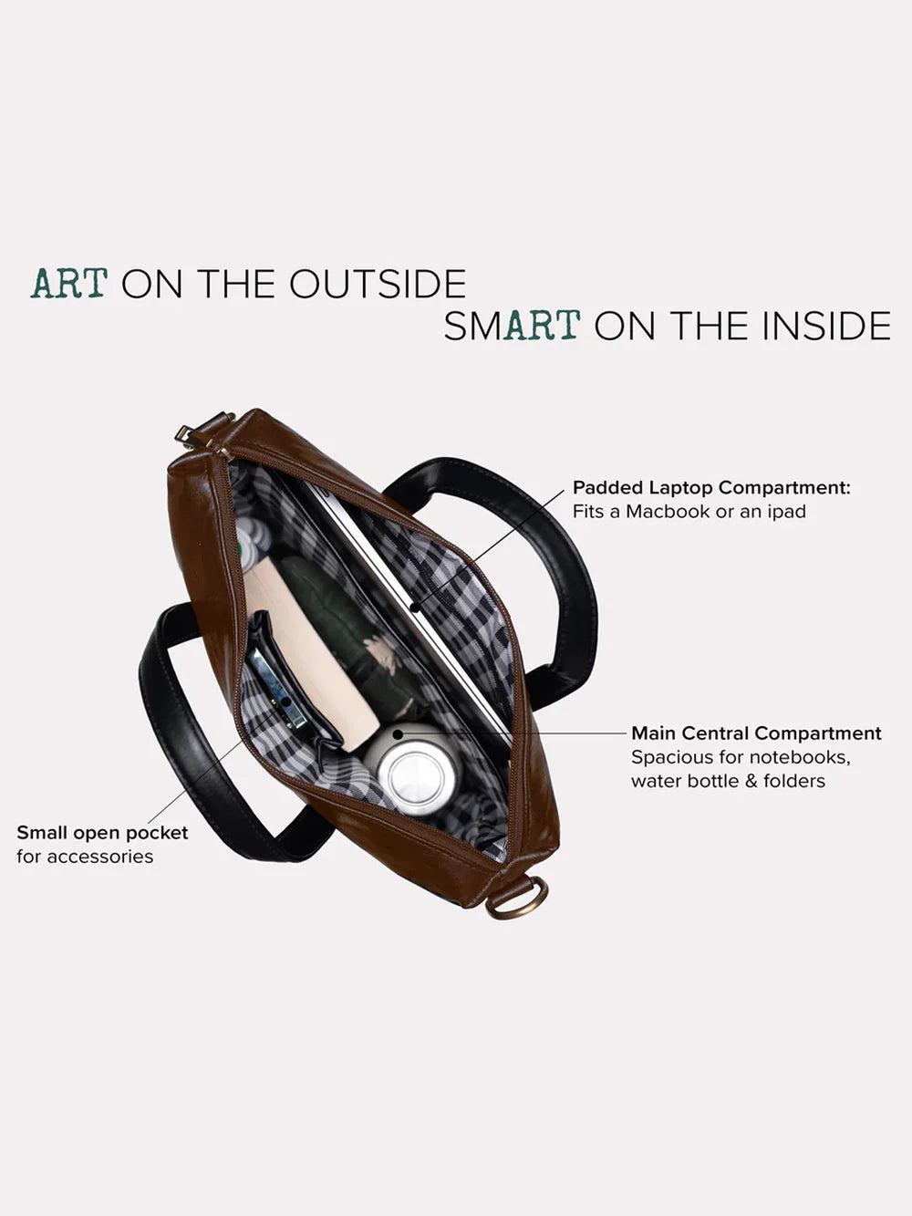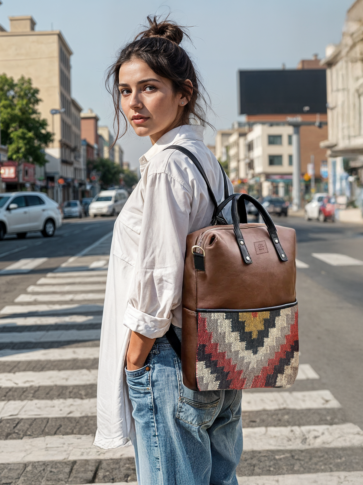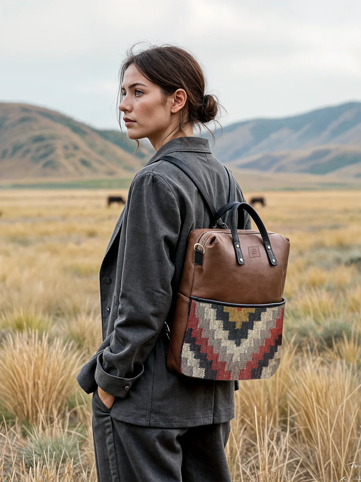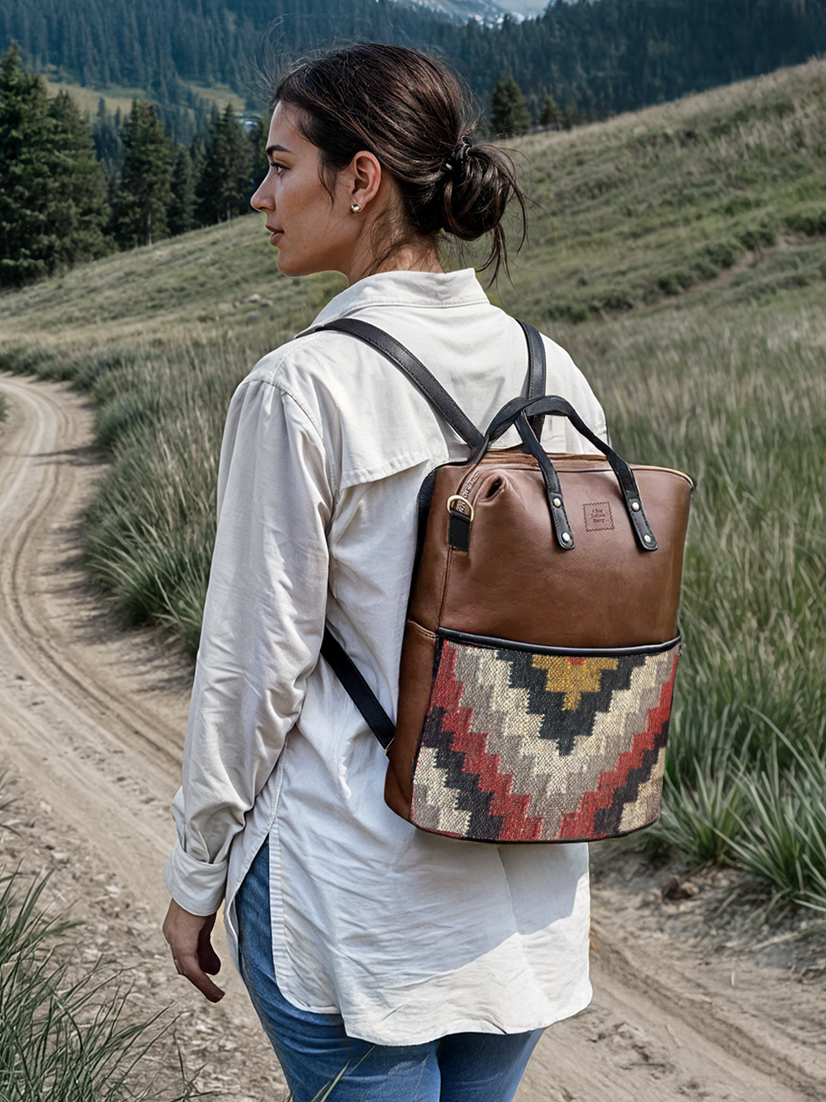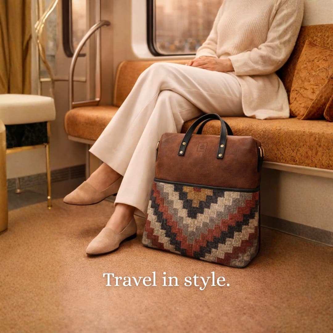 New launch! One of our signature bestselling bags, the ABIS convertible is the perfect accessory for a woman or man on the go. This convertible bag in tan Vegan Leather has been made using a rare Mirzapuri handwoven kilim in reddish hues. Daytime backpack, office tote or a weekend sling - pick your mode and just adjust the straps as you like. Cool hmm :) comfortably fits a sleek 16 inch MacBook or a similar sized laptop.